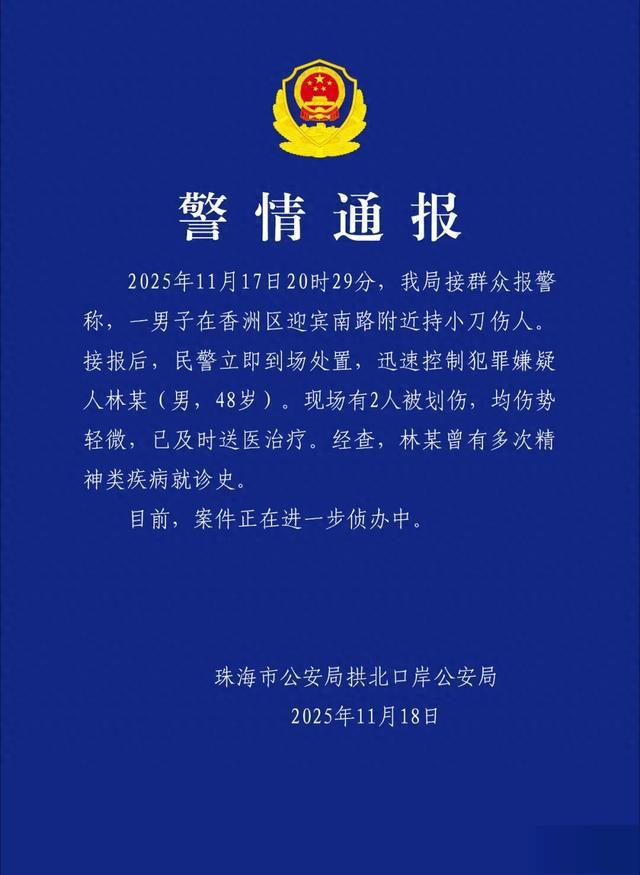 11月18日,珠海市公安局拱北口岸公安局发布警情通报称,11月17日20时29分,公安局接群众报警称,一男子在香洲区迎宾南路附近持小刀伤人。接报后,民警立即到场处置,迅速控制犯罪嫌疑人林某(男,48岁)。现场有2人被划伤,均伤势轻微,已及时送医治疗。经查,林某曾有多次精神类疾病就诊史。目前,案件正在进一步侦办中。