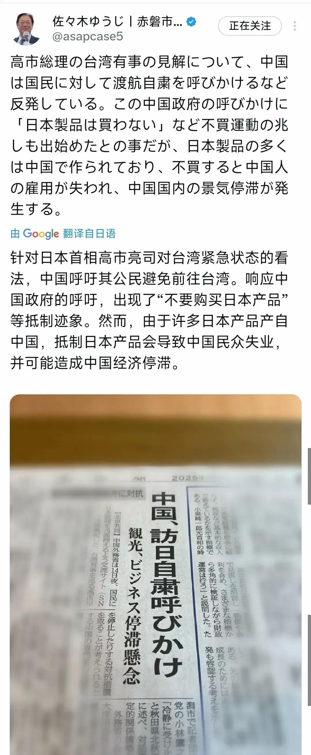 果不其然。 日本政客高市早苗突然宣布了。 据多家媒体报道,她在涉台话题上公开抛出“武力介入”和“行使集体自卫权”的说法,这一步把气氛一下拉紧。 紧跟着,日本议员佐佐木裕二也发文,提醒抵制会让中国工人受影响,这个点说的并不空。 工厂端的细节摆在那儿:广东的电子装配线、江苏的汽车配套,长期用日本的芯片、传感器、机床,像瑞萨、尼康测量设备、发那科机器人,都是常见货。 对照过去几年,日本对华买卖也没停,企业担心两边口水变成动作,订单和产线就得跟着跳。 时间线拉回去看,安倍在任内谈涉台更多是含蓄,明确的强硬表态多出现在卸任之后;现在高市把话挑明,格外扎眼。 合作是现实,但底线更是现实,这两件事必须同时成立,任何一方把话说过了,企业和市场先受累。 从现场看,中方近年在东部海空训练和通报都按节奏推进,强调把沟通和控风险放前面,尽量避免误判。 反过来看,日本国内对“集体自卫权”的讨论在2014年出现过重大解释变化,社会争论一直在,那些顾虑今天并没有消失。 一旦把措辞升级成动手的信号,外企的合规部门会提高预警,物流、保险、融资成本马上垫高,工人和中小厂最先感到压力。 所以话要说清:经济拧在一起是事实,维护正常来往是共同利益,同时,涉台红线不能碰,这也是事实。 把节奏稳住,别让情绪牵着产业走,能谈的就谈,该退的就退,不给极端声音留舞台。 高市早苗这波强硬话术,必须明确反对;中日该做的,是把合作与底线两手都握紧,让风险降到最低。