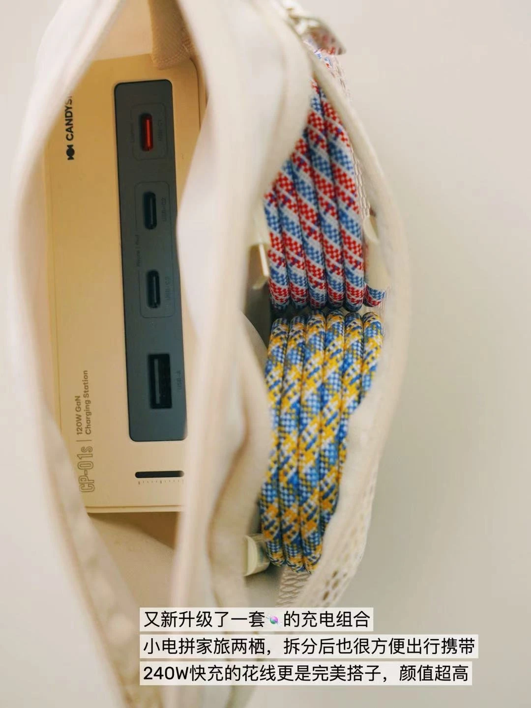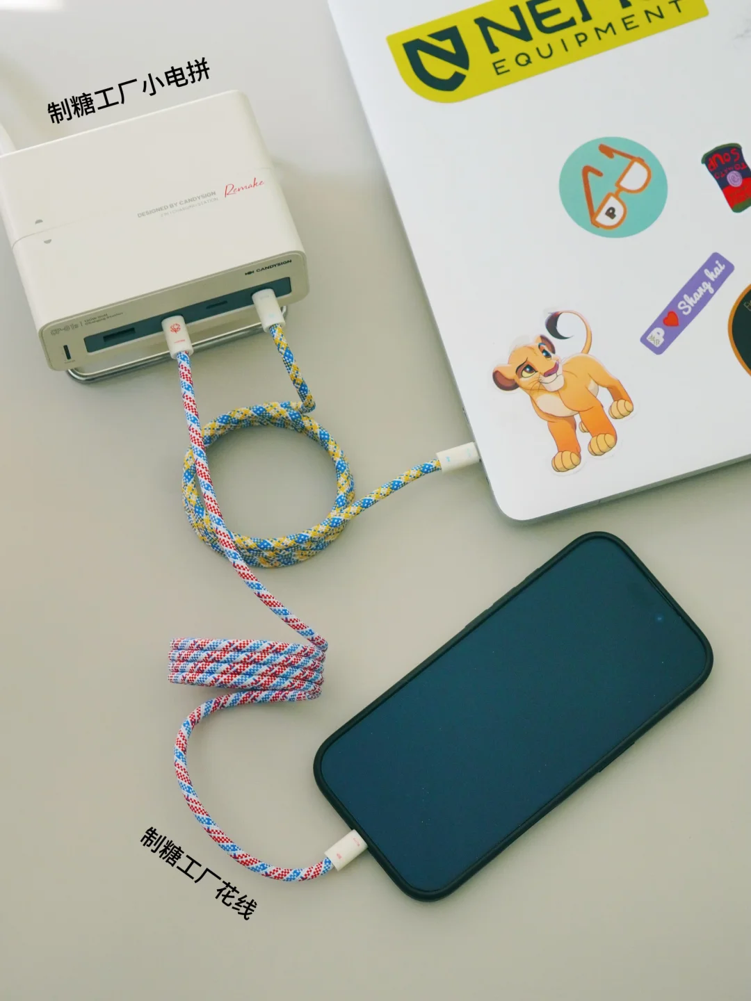 小电拼可以说是制糖工厂的经典款,主打一个家旅双栖。花线还是一如既往地【情绪价值】拉满,编织纹理很细节,新升级的细丽端子,与充电口等宽,能无缝适配不同大小的手机壳👍