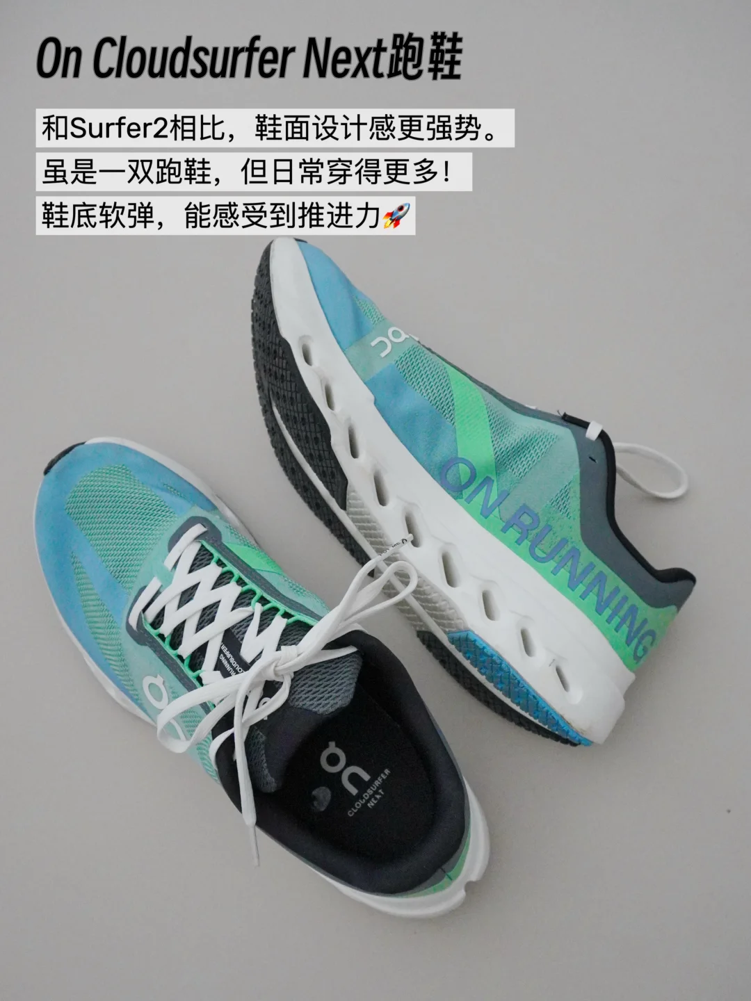 轻量缓震,脚感畅快。和Surfer2相比,鞋面设计感更强势。跑步能穿,日常也能穿,鞋底软弹,能感受到推进力。