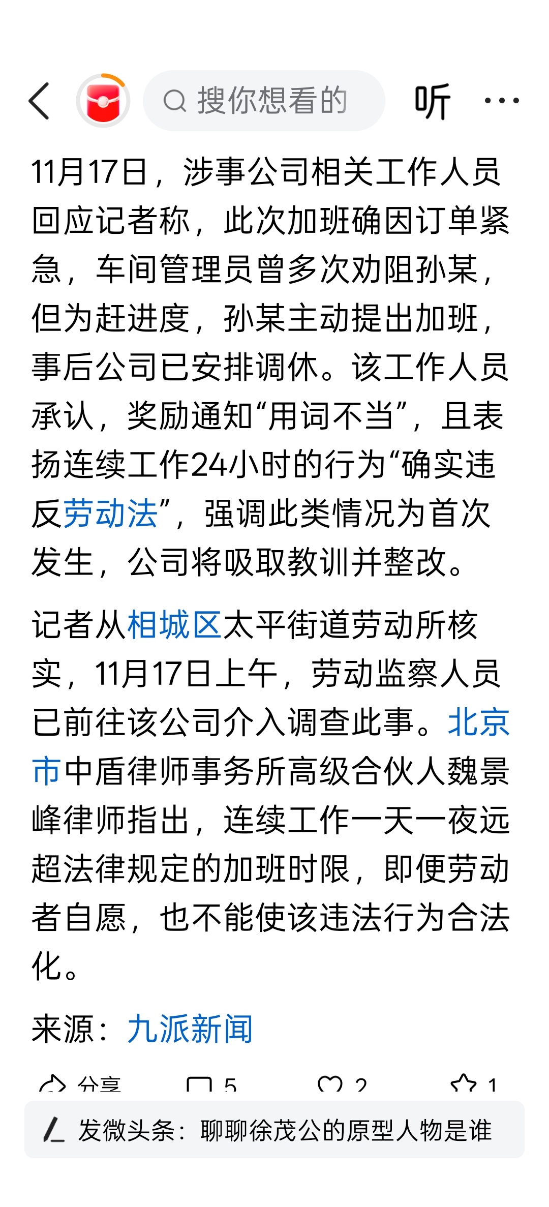 苏州一公司表扬员工连班24小时引热议,劳动部门已介入