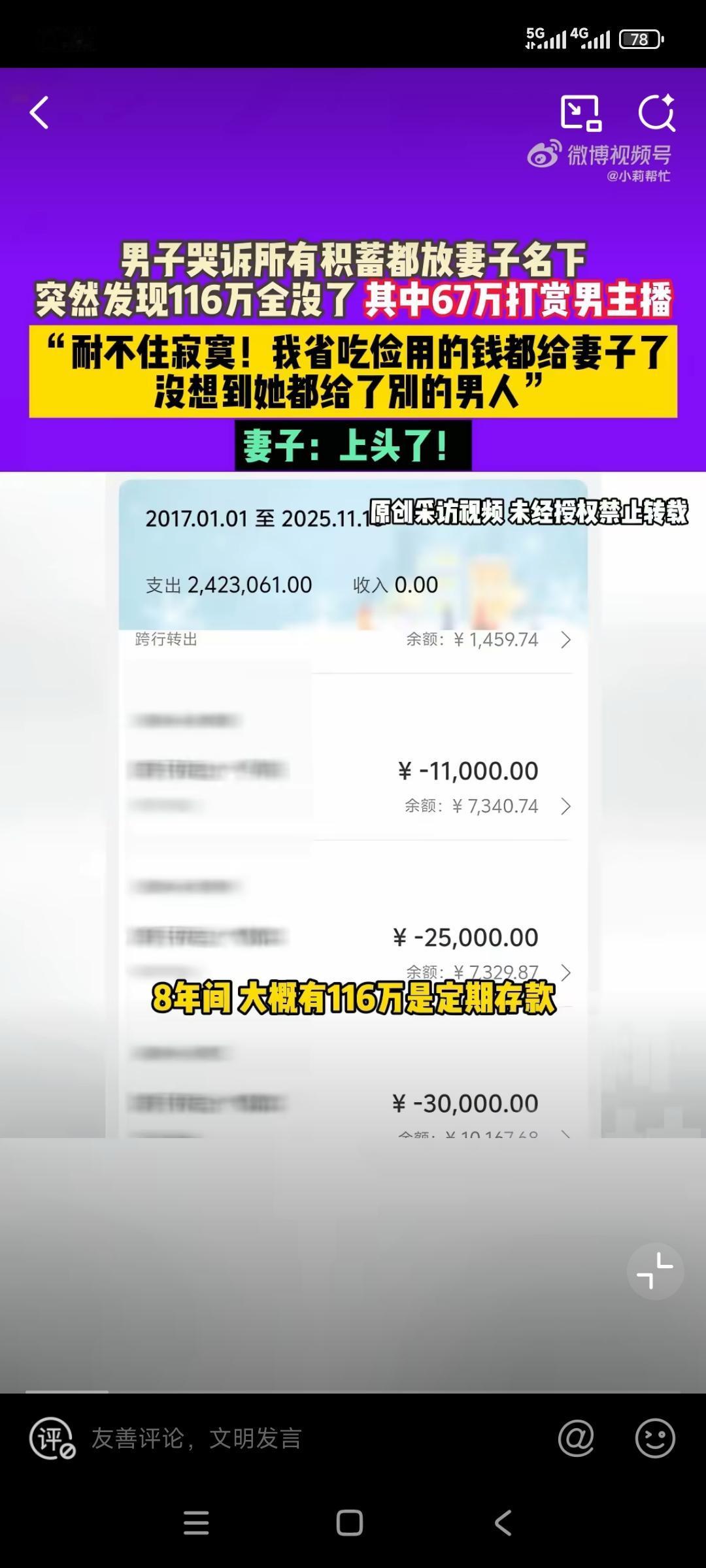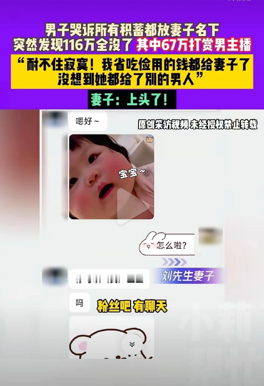 娶这种老婆, 真是倒了八辈子血霉! 河南刘先生结婚八年,在外面打工住300块出租屋,省吃俭用把钱都给老婆,一心想让老婆孩子在家过好一点。 8年累计积蓄有117万。 万万没想到,最近一看账户只剩下0.3元,还倒欠网贷8万元。 其中有67万被老婆打赏给男主播了,剩下的也说不清花哪里了。 一瞬间,刘先生的天都塌了。 娶这么一个不着调的老婆,还真不如打光棍呢!