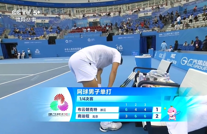 直播吧11月18日讯全运会网球男子单打1/4决赛,布云朝克特vs商竣程。商竣程在带伤作战的情况下,先输一盘3-6、6-4、6-4逆转头号选手布云朝克特。