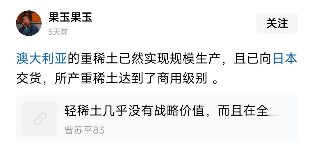 稀土大头掌握在中国手里,于是稀土就被贬的一文不值。奥观海那会就说要发展了,十几年没搞定的事,现在几天就搞定了。