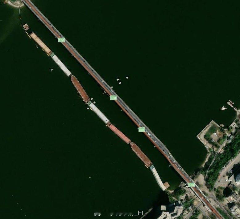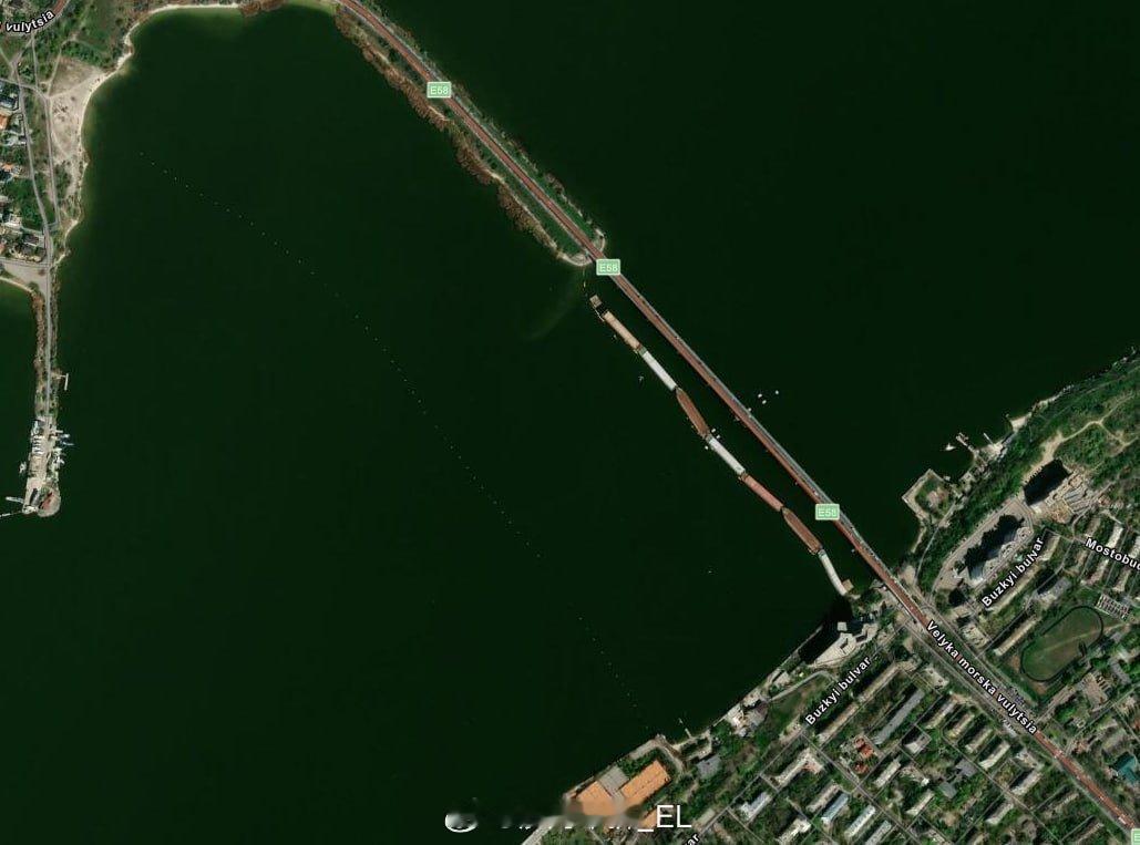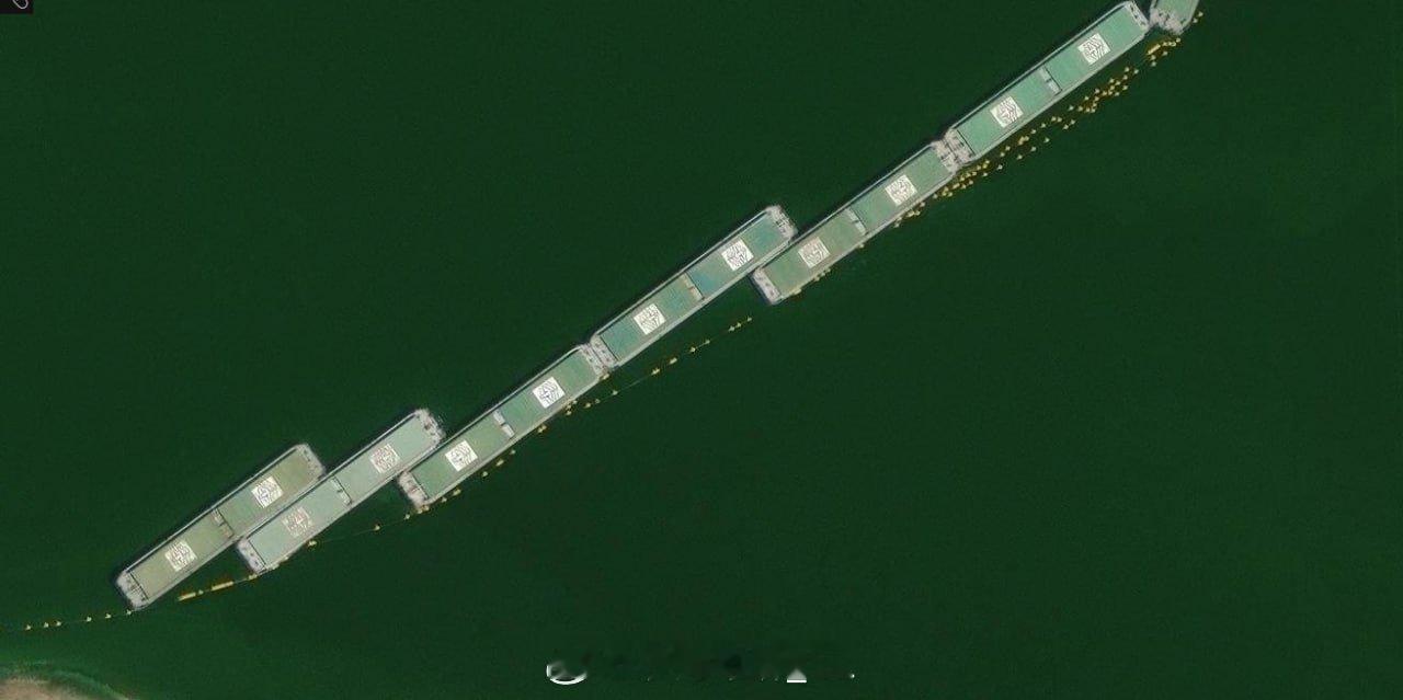 乌克兰尼古拉耶夫市的跨河大桥旁摆了一排屏障,可能是预防俄军的遥控自爆艇袭击。