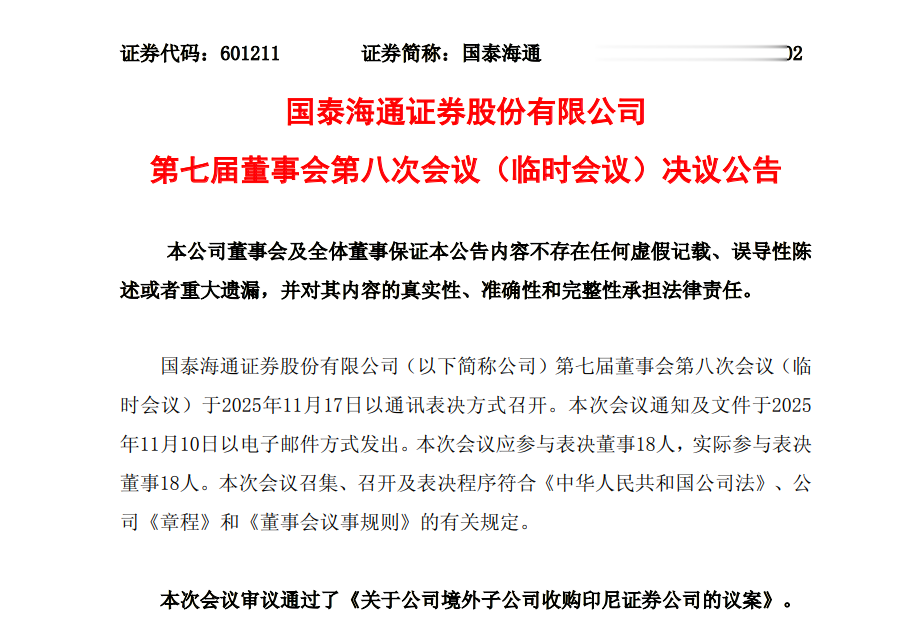 国泰海通(02611.HK)于周一(11月17日)发布公告,公司董事会会议审议通过其境外子公司将收购一家印尼证券公司的议案。