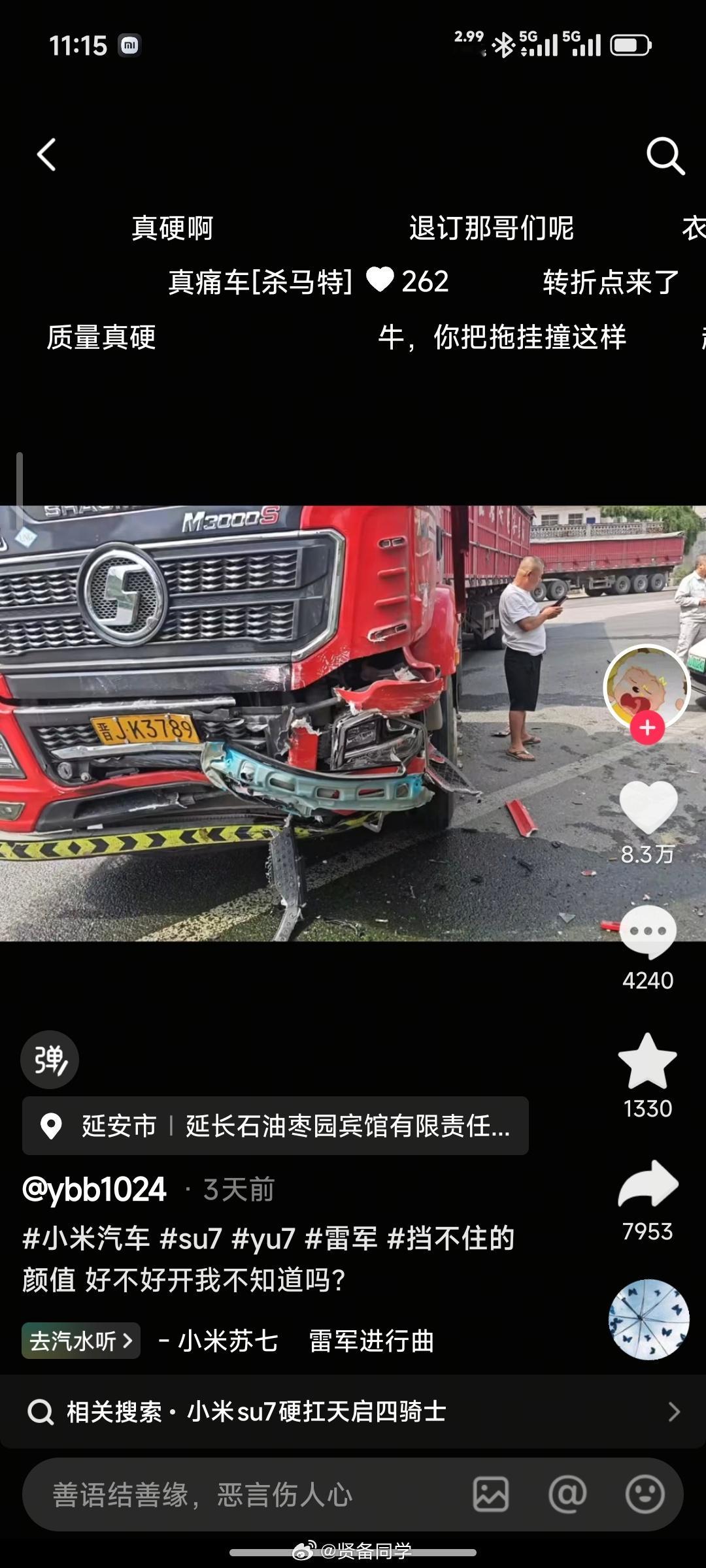 你看这位小米车主就是完全不懂流量,好在网友们是真懂啊!这辆小米SU7被大卡车撞击
