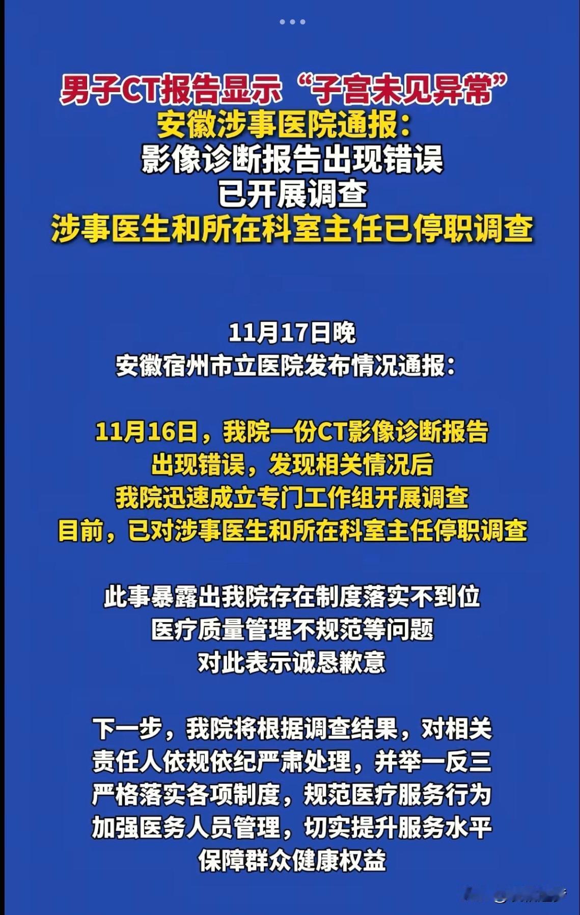 “太荒唐了!”安徽宿州,一男子到医院看病,拿到ct报告单后,一下子傻眼了,不是被病情吓到了,而是报告结果赫然写着:“子 宫及双侧附件未见明显异常。”男子当既认为这份报告有假,气得当场找医院讨 说法! 他一个大老爷们,怎么会有子 宫相关的检查结果?花大价钱做的腹部检查,本应该真实可信,出现这种低级错误,他压根不敢相信报告的准确性,这钱分明是白花了! 根据纵览新闻11月17日报道,这件离谱又匪夷所思的事就发生在一家三 甲医院里。 男子愤怒的拿着报告找到了医院,质疑了上面结果准确性,就冲着“子 宫及附件”这几个不应该出现的字,他认为,现在报告上面的结果,一个字他都不信! 花了几百元的腹部检查,就是为了明确病因,医院的做法让男子认为非常不负责任,看了这份报告后,医院工作人员也觉得有些离谱,这事往小了说可能是笔误,往大了说也可能是结果不真实,于是医院很快表示会成立工作组调查此事。 目前,根据医院通报,整个科室已经做了停职调查处理,看病检查本来应该是件严谨的事,也希望这样的事情不要再次出现。 有网友说:这一看应该是用模板修改,很可能前面一位患者是女性,忘记删掉没改就发出去了。 也有人觉得这种事虽然小,却是不可原谅的错误:性别都能搞错,这真的是认真做事的态度吗?难道出报告之前核对一下很难吗? 其实这件事根本不是笔误或者修改模板能说的过去的,CT报告更不是随便敲几个字就可以的,影像科里至少都会配有两个人,并且出报告前还得经过书写、审核、复核好几道关,即便一个人写错了,其他人仔细一看也会发现错误,这种连性别都搞错,可见检查流程形同虚设。 万一真患者真有病情被这种马虎态度漏掉,后果谁来承担?这种疏漏,真该查清楚到底是哪个环节掉了链子了