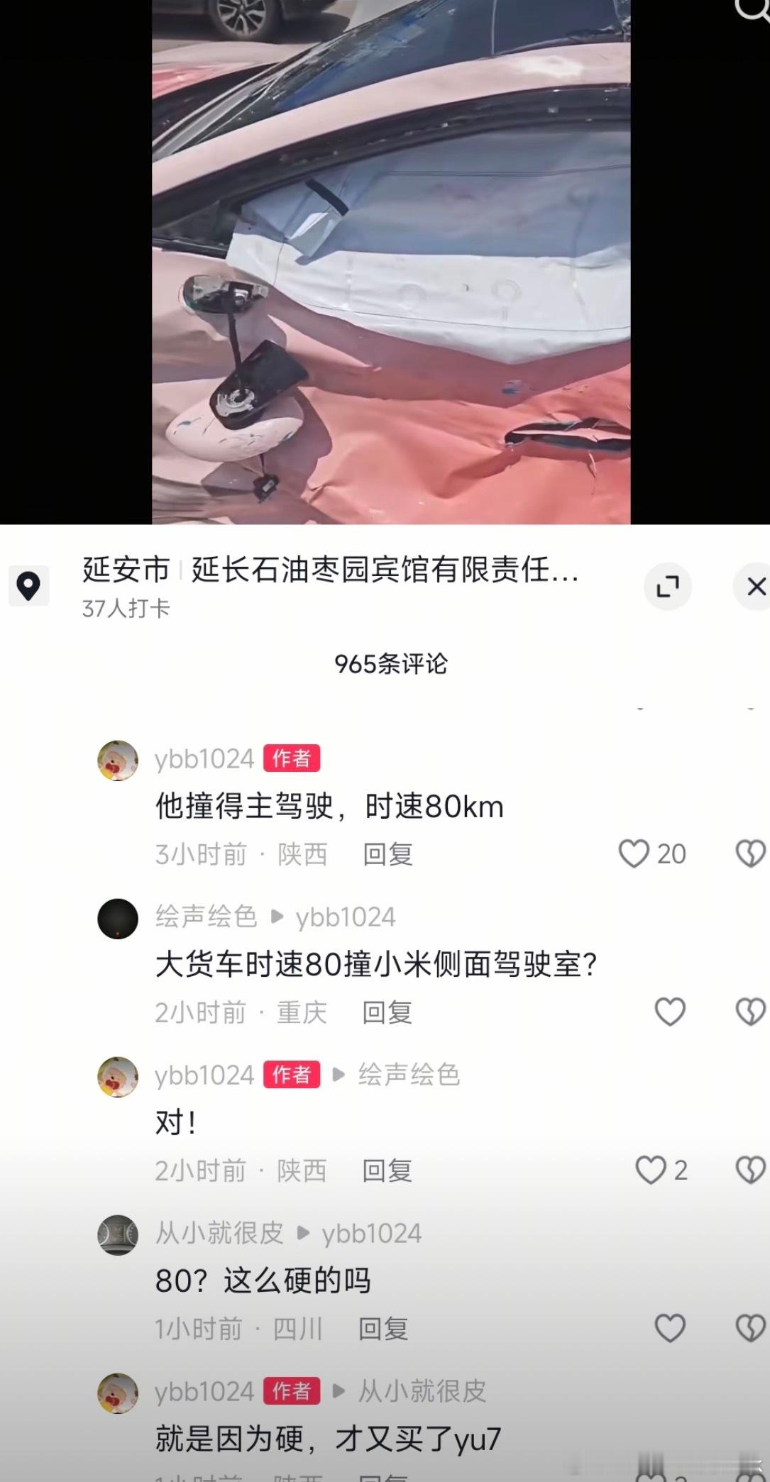 看看小米SU7的实战表现,时速80大货车侧面撞击,SU7直接扛住了伤害,这么硬的