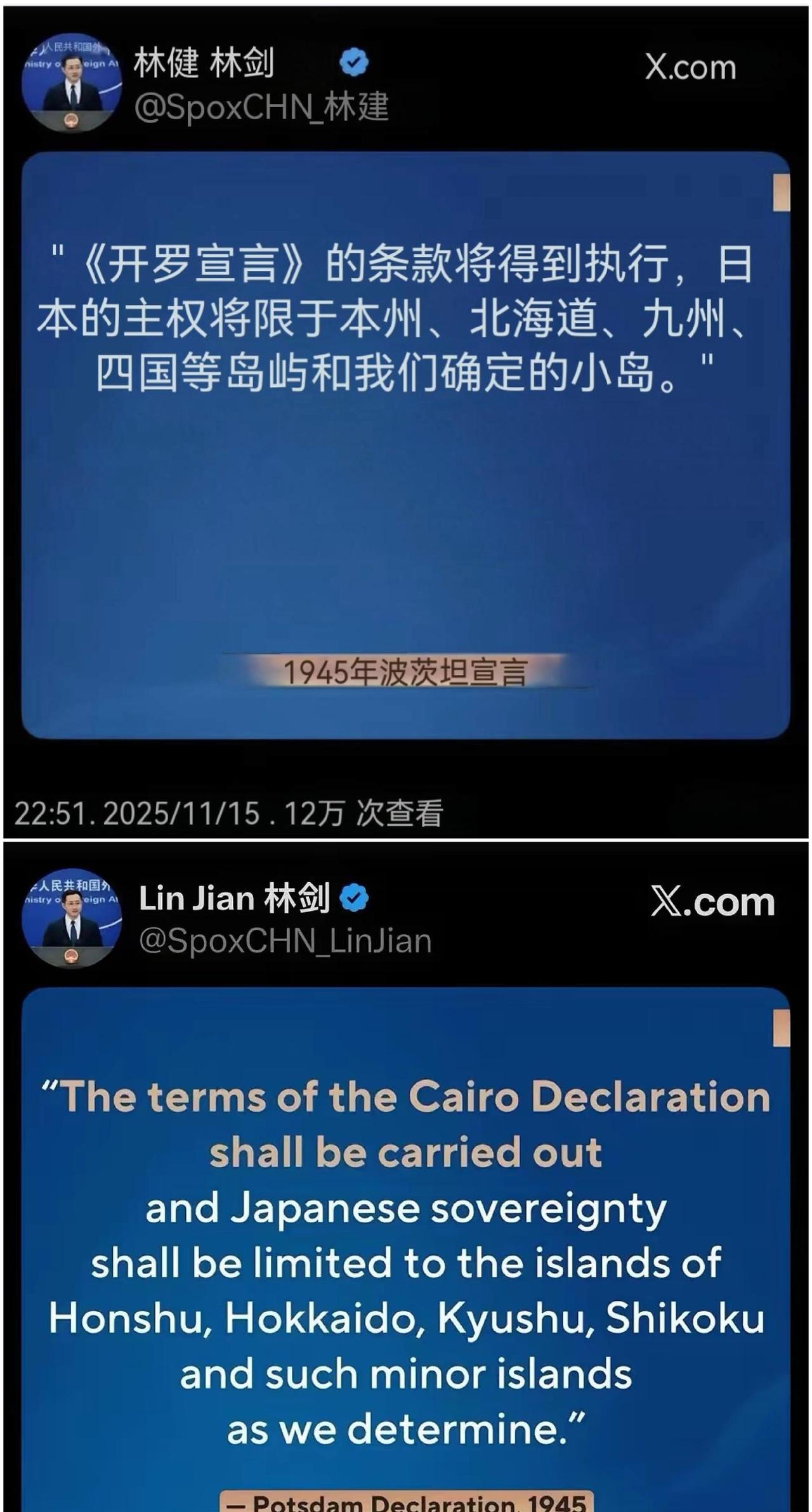 果不其然。 据媒体报道,我国有关方面突然宣布了要以《开罗宣言》为依据提出立场。 1943年11月,《开罗宣言》清楚写到:日本从中国窃取的领土应归还中国,其中包括台湾和澎湖。文件由中、美、英三方发表,苏方随后在对日事项上也表态支持,这些都有公开文本可查。 往后看,1945年的《波茨坦公告》第八条把话写得更明白:必须执行《开罗宣言》,并且日本的主权范围被限定在本州、北海道、九州、四国以及盟方认定的小岛。这条是整套安排里的关键,直接确定了战后日本的框框。 日本在1945年9月2日的投降书上签了字,承诺接受《波茨坦公告》。签字地点、签字人、文本内容都有档案,承诺不是口头,是落在纸上。 随后进入占领期,由盟方主导的管理一直持续到1952年《旧金山和约》生效。占领区不是长期划地为王,按照公开时间线结束,留下的是一套安全安排和条约挂钩的权限,这些都记录在公开文件里。 涉及到台湾的条文,1945年10月25日在台北举行了“台湾光复”典礼,行政机构接管,这是把《开罗宣言》中的归还条款真正落地的节点。日本方面的撤离和权力交接,都有同期文书和新闻报道作证。 但到1951年的《旧金山和约》,事情转了一道弯:日本放弃对台湾、澎湖的权利,但没有在条约里写明归属对象。中方当时未出席,这为后续争议埋下伏笔,这点在学界和公开材料里讲得很清楚。 1972年《中日联合声明》把关系正常化,日本承认中华人民共和国是中国的唯一合法代表,中方重申“台湾是中国的一部分”,日方表示“理解并尊重”中方立场。措辞的差异,实际影响到了之后的表述空间。 再看钓鱼岛这条线,1971年《琉球群岛及大奈良群岛归还协定》后,美方向日本移交了对相关区域的行政管理,日本在1972年开始实际管理。美方公开说对主权不持立场,但防务条约适用相关岛屿,这也是近年各方说法的基础。 所以把《开罗宣言》摆上桌面,不是临时起意,而是把历史文件链条重新梳理。谁在什么时间签了什么文件,文件写了什么范围,按照这些去说话,底气来自文本。 日本国内的表述长期坚持所谓“固有领土”,同时海上巡逻和无人机监视常态化,这些公开记录不少。对比之下,我们强调的是二战文件体系和承诺的履行,这条线比拼的是证据,而不是口号。 我们这边的法理材料并不缺。2012年发布的《钓鱼岛是中国的固有领土》白皮书,把史料和坐标都整理过;近年的海上执法举动也按规则推进。拿出《开罗宣言》,是把根基再一次明白地标出来。 说到底,这是一次把话说回历史原点的动作。把条文、时间点、签字人和后续实际执行串起来,逻辑就站得住。 下棋讲顺序,文件讲链条。只要把链条捏稳,面对任何新的说法,都能按图索骥,一条条回应。 这事不需要提高声量,需要提高证据密度。把1943到今天的每一环扣紧,立场自然清楚。