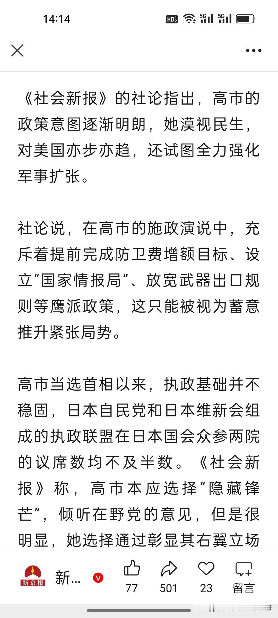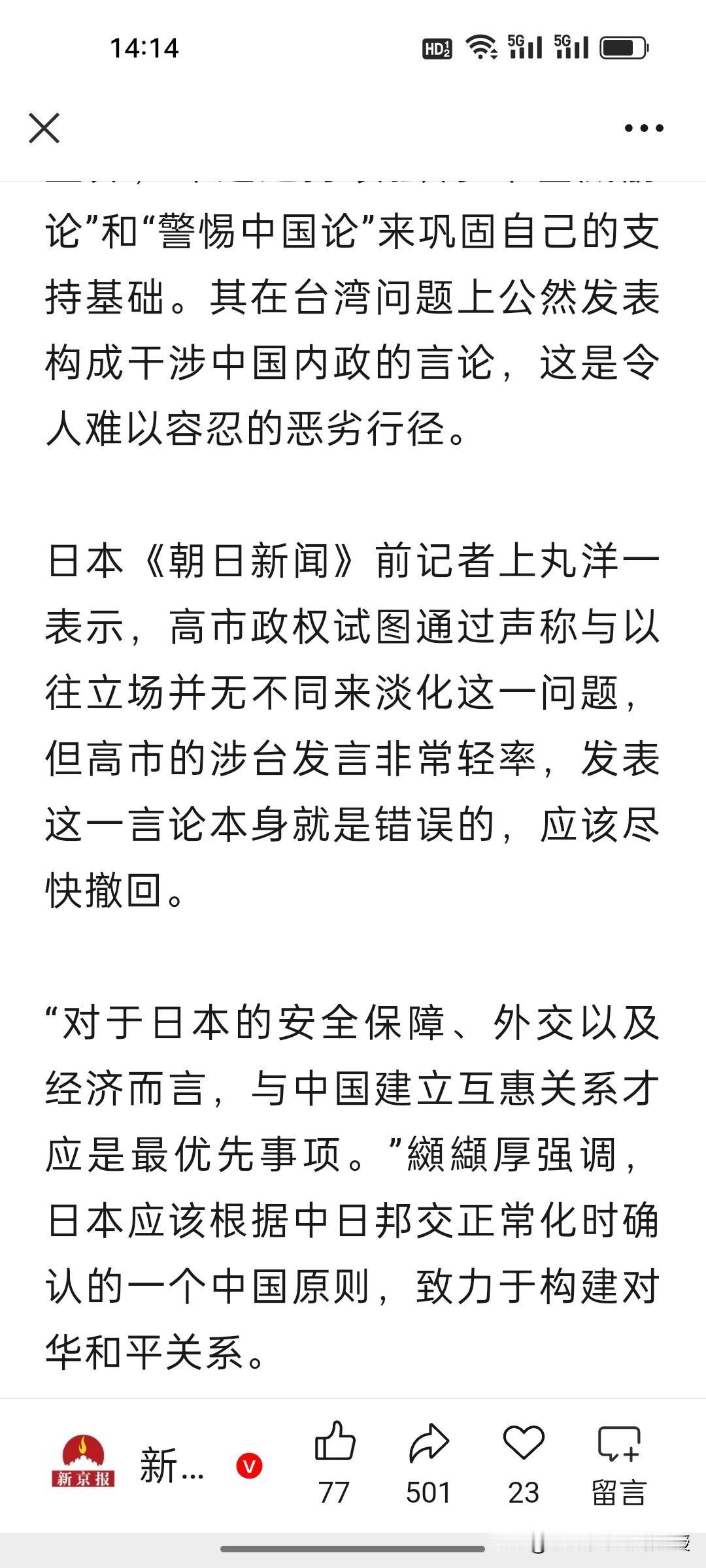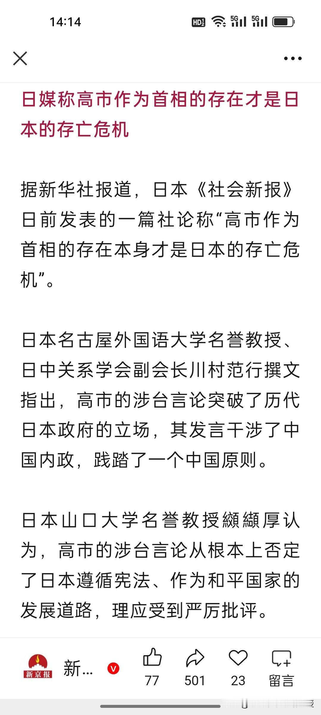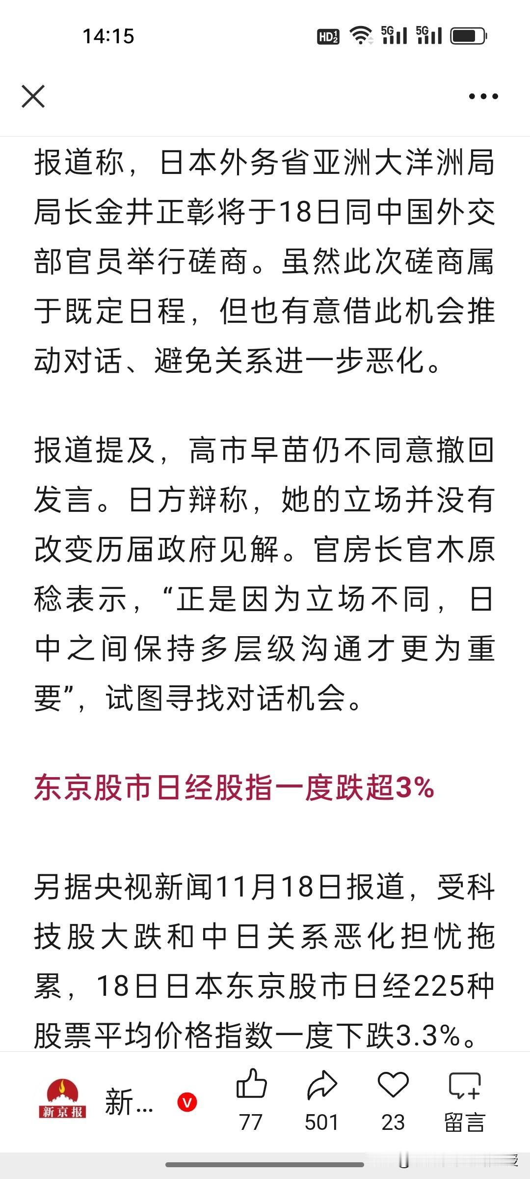 真是个“硬苗”啊!高市早苗还是坚持不撤回自己言论啊!看下图,刚刚,根据《朝日新闻》报道,高市早苗仍然不同意撤回发言。消息一出,日本股市大跌3%。 日本虽然派了外务高官前来中国磋商,但是仍旧缺乏诚意。高市早苗眼看着中方采取反制措施,但是仍然不悔改,这背后是日本右翼势力妄图突破和平、重拾军国主义野心的狂妄作祟,更是对历史正义与国际关系准则的公然践踏。 高市早苗无视自己言行对日本经济和股市的破坏,终将让日本为其危险行径付出难以承受的代价。