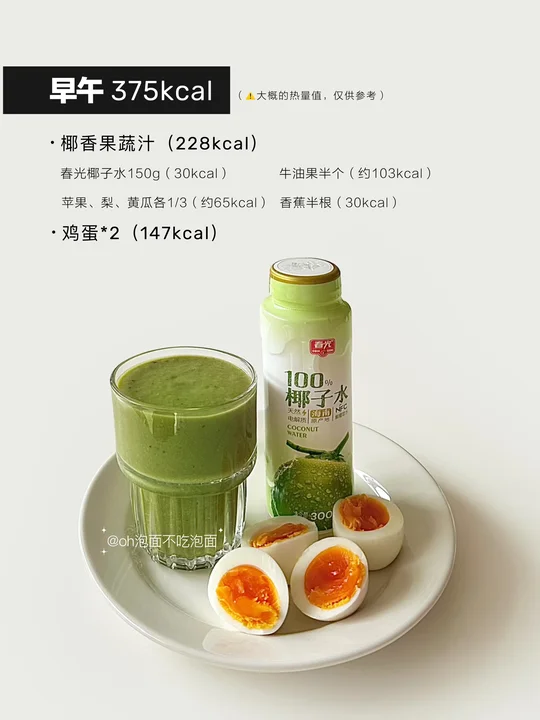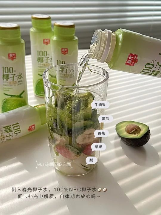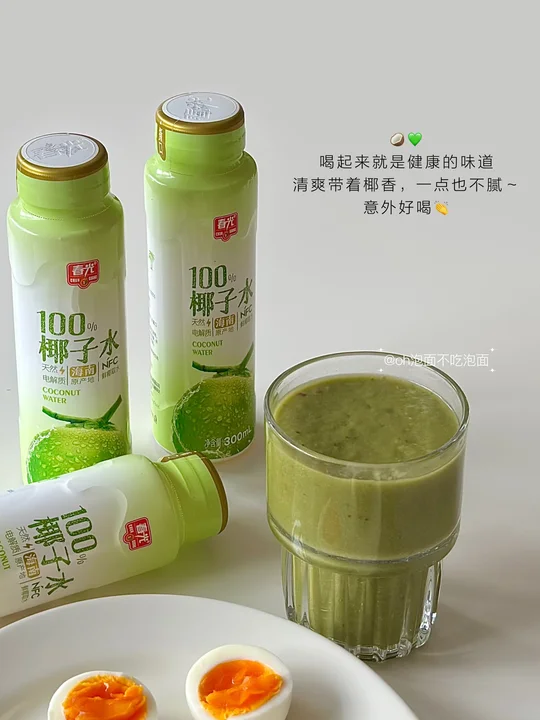 🥣 早午:椰香果蔬汁,鸡蛋 晚:牛油果拌饭 📝 大餐后轻断食又提上日程啦 早午餐就是绿色果蔬汁🥒🥑+鸡蛋🥚 牛油果、黄瓜等果蔬搭配春光椰子水一起榨 就收获一杯绿油油的低卡健康汁啦~ 老国货海南春光,海南原产100%椰子水 入口很清爽,有股椰子本身的果香,完全不甜腻~ 而且配料表敲干净, 0️⃣添加白砂糖+0️⃣脂肪,自律期也放心喝 日常补水补充电解质,出门随身带一瓶也敲合适 最近冰箱又是被春光椰子水占据了👏 晚上消耗掉剩下的半个牛油果 几分钟搞定一碗敲快手牛油果拌饭,香! 轻断食也可以好好吃饭~