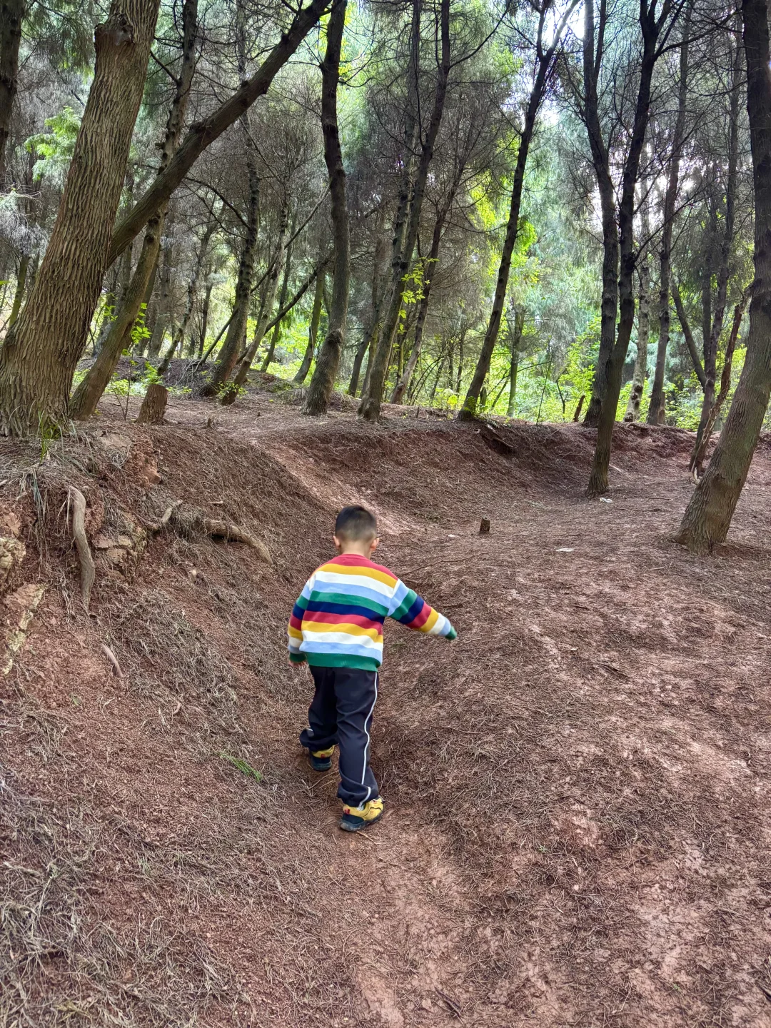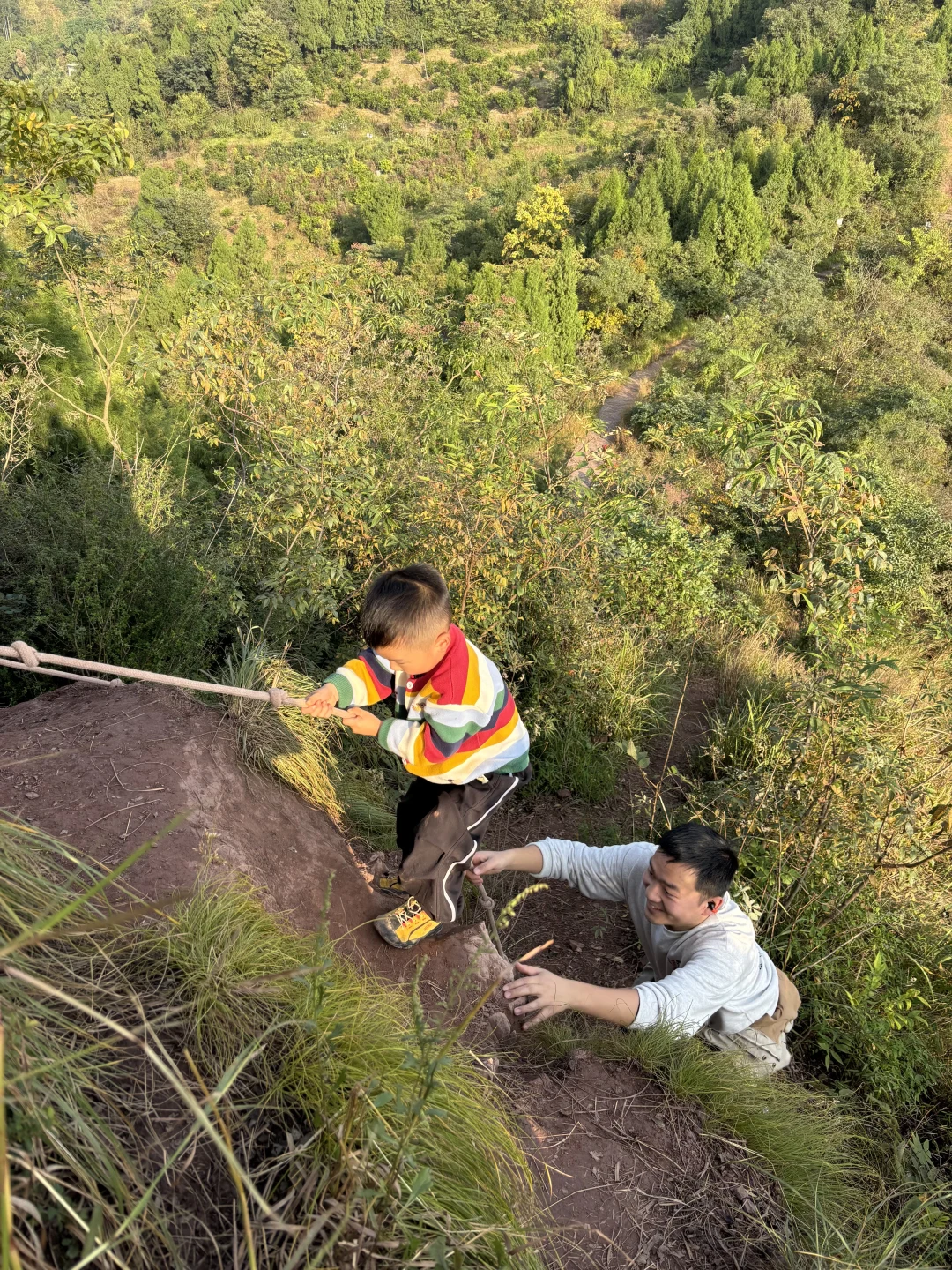 2,野路线:另外一条野路子,足够野!!沿着步道走的中途,遇到一个泥土路岔路口(见图5),一路向上,穿越森林与荆棘,直达山顶,到达山顶后,走左边的小路,然后沿路下坡,遇到绳索下坡,则可回到主干道。这条路线5岁以上的孩子可以冲!!