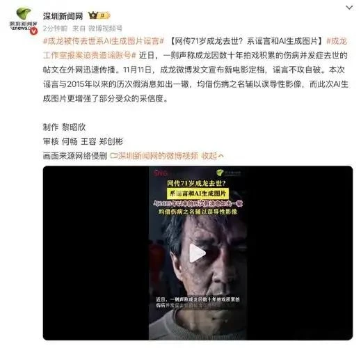 当71岁成龙吊着威亚翻越高楼时,全球百万网友正含泪转发他的“AI死亡通知”——这张由代码生成的病床照,连手表反光都精确复制港媒镜头。518