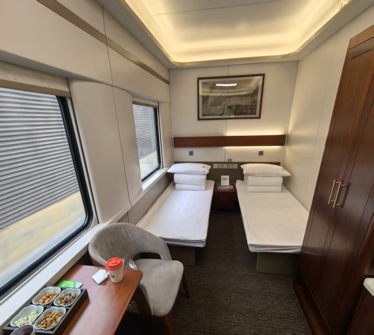 无微不至的适老化改造也是一大亮点。工作人员介绍,列车完成了数十处适老化改造:双层全景车窗增强采光,客室过道铺设防滑地毯,夜光扶手、360°防滑脚凳梯全方位守护安全;包厢内优化床铺高度,床头集成紧急呼叫按钮,卫生间配备恒温马桶与SOS装置,细节处尽显人文关怀。