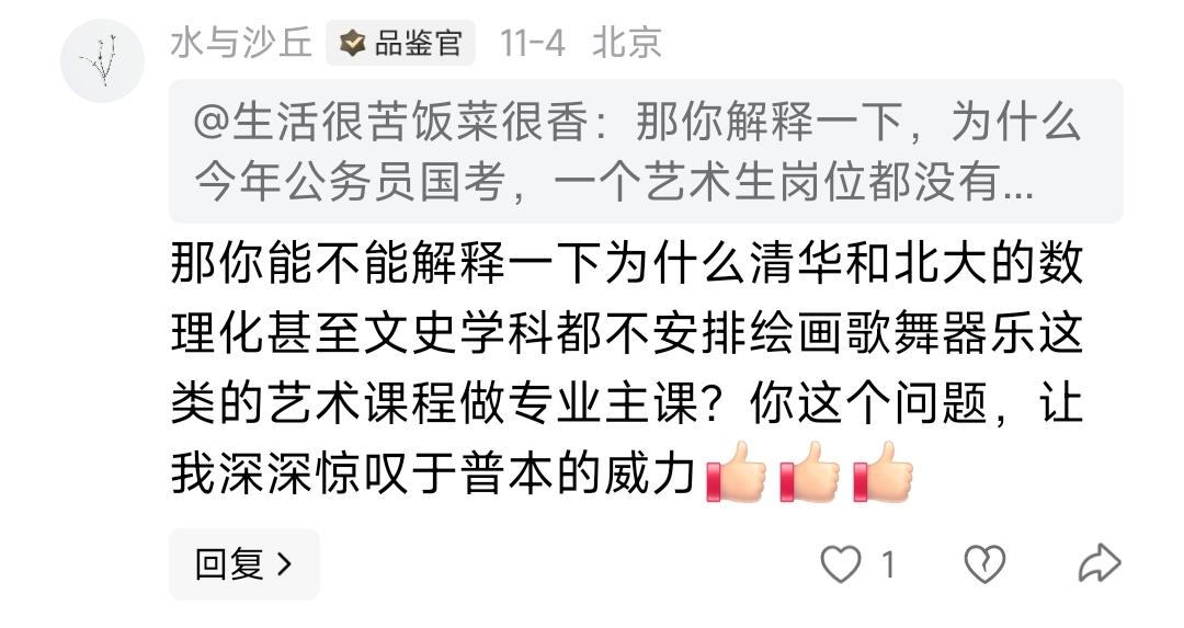 果然,屁股决定立场。艺术类出生的,就一定要各种论证艺术生的高贵,以及对普通本科生的蔑视。左右脑互搏的是,他一边强调考试分数不代表什么,一边又看不起别人普本。所以,他到底是看中高考分数还是不看重高考分数?