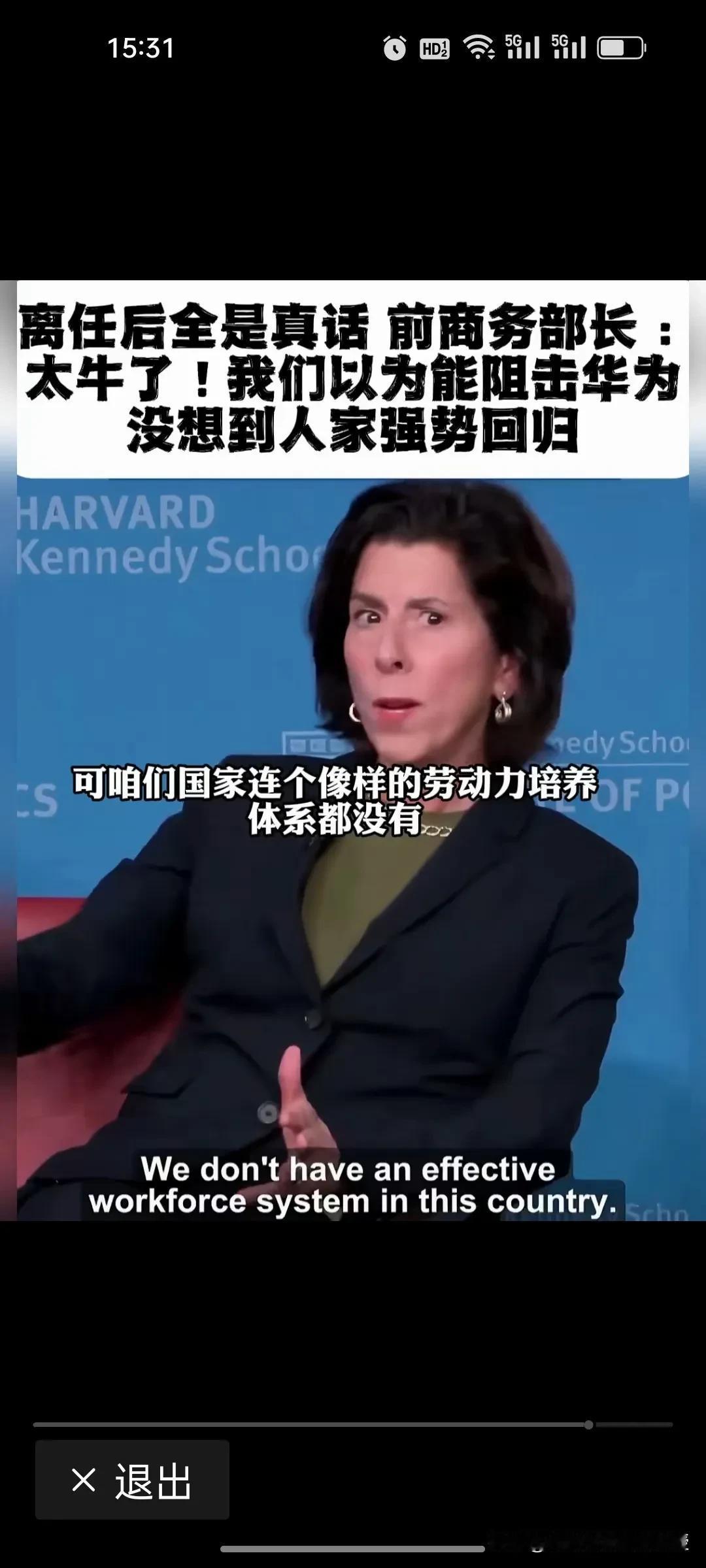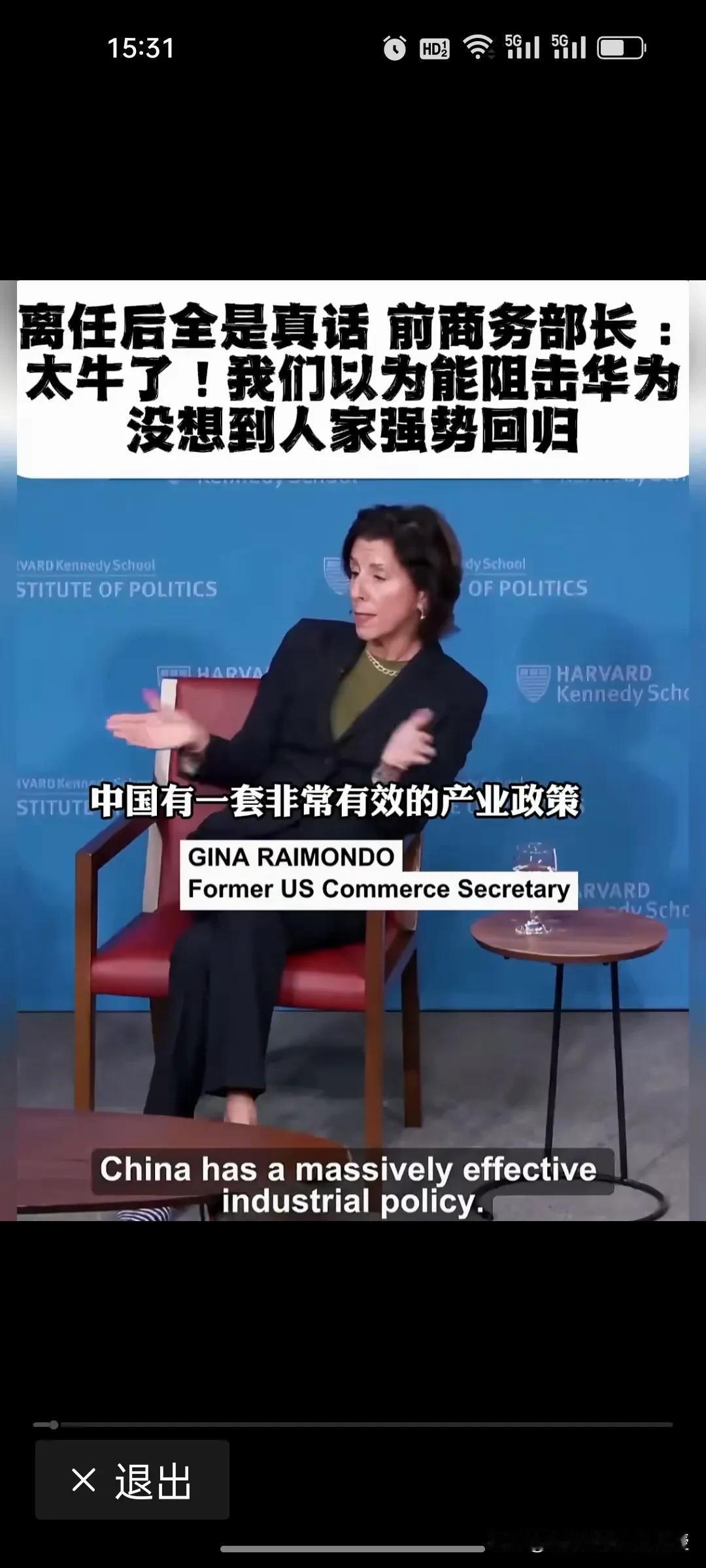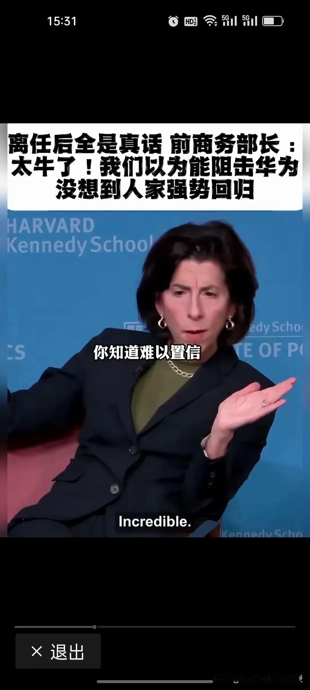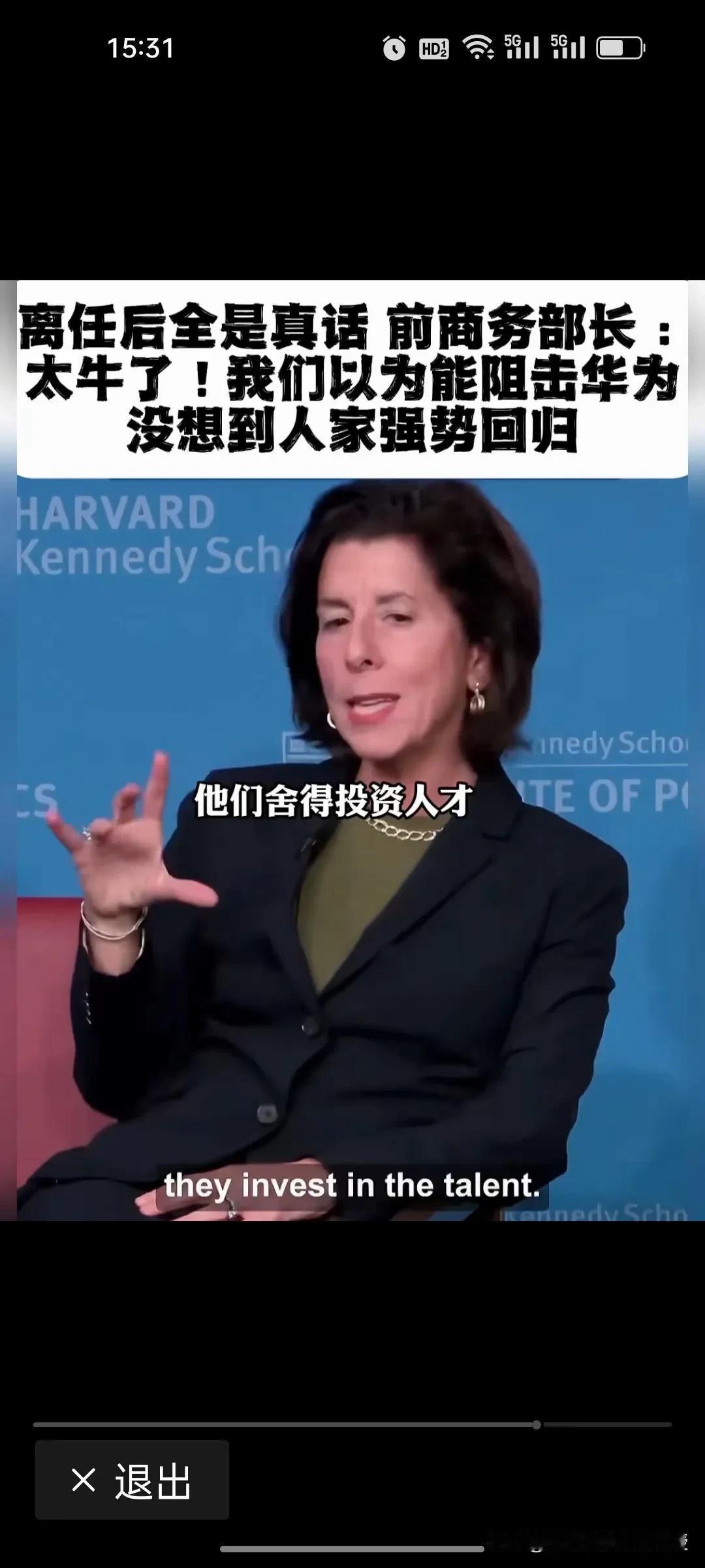 去年曾说“北京一按键,就能让在美国开的中国汽车全部熄火”的美国前商务部长雷蒙多,近期在哈佛大学说了一番大实话。 她说上上届政府以为能搞垮华为,结果人家带着更牛的芯片强势回归。中国舍得投资人才,而美国连像样的劳动力培养体系都没有,中国有非常有效的产业政策。 雷蒙多在拜登政府任期内,曾经要调查中国产的汽车以维护国家安全,如今卸任后,没有了政治枷锁,实际上,她对中国是无比钦佩的。