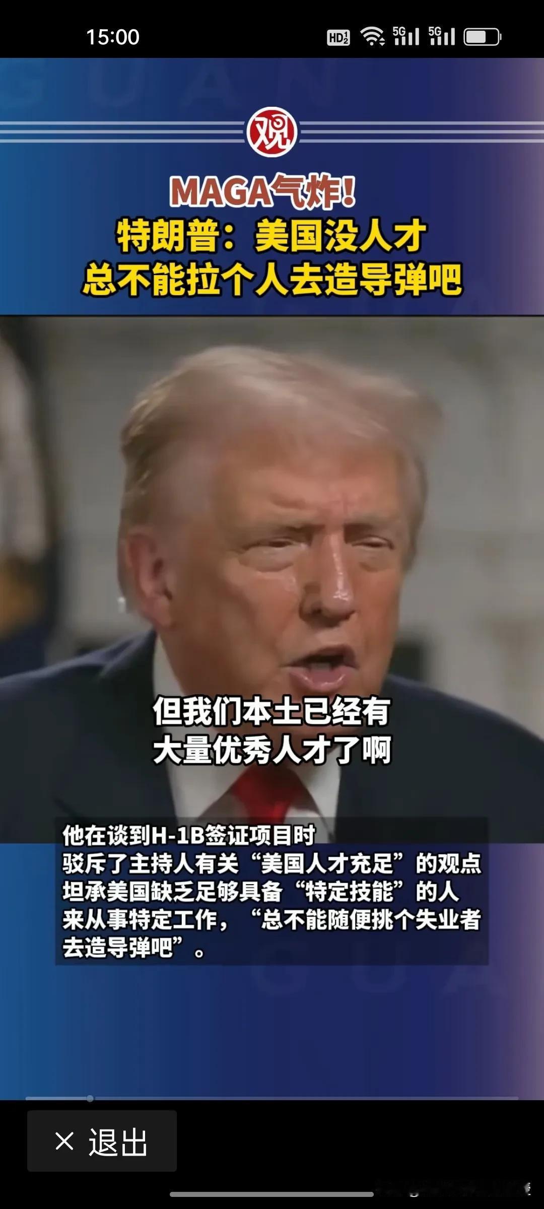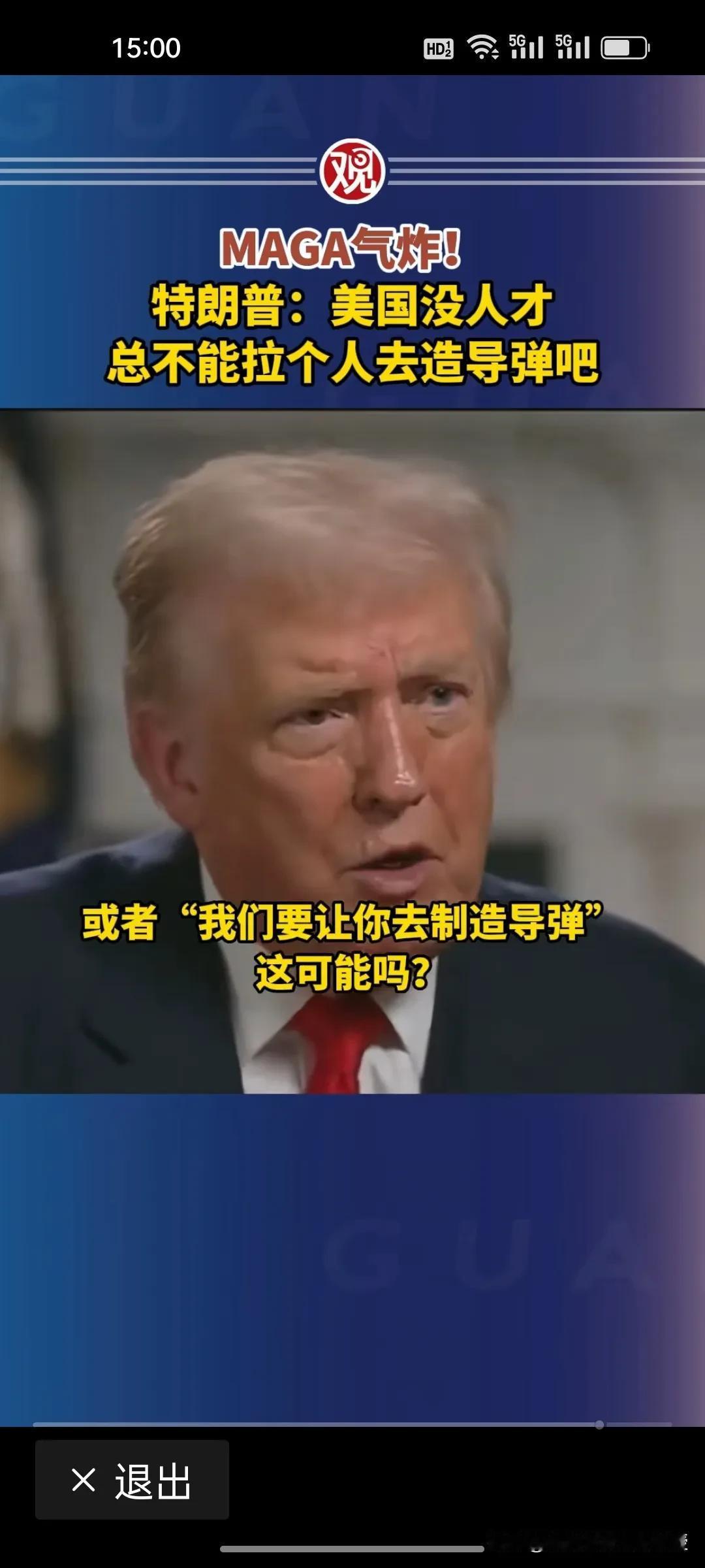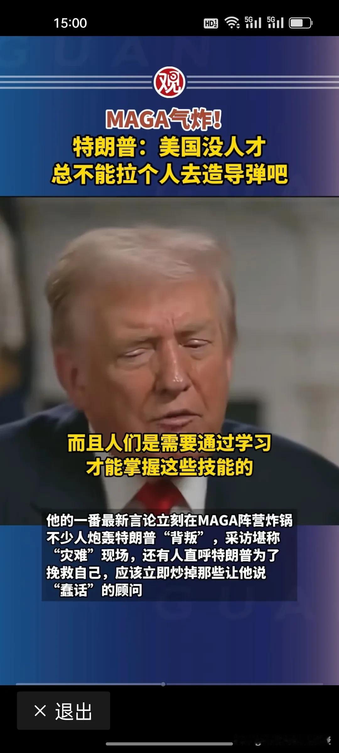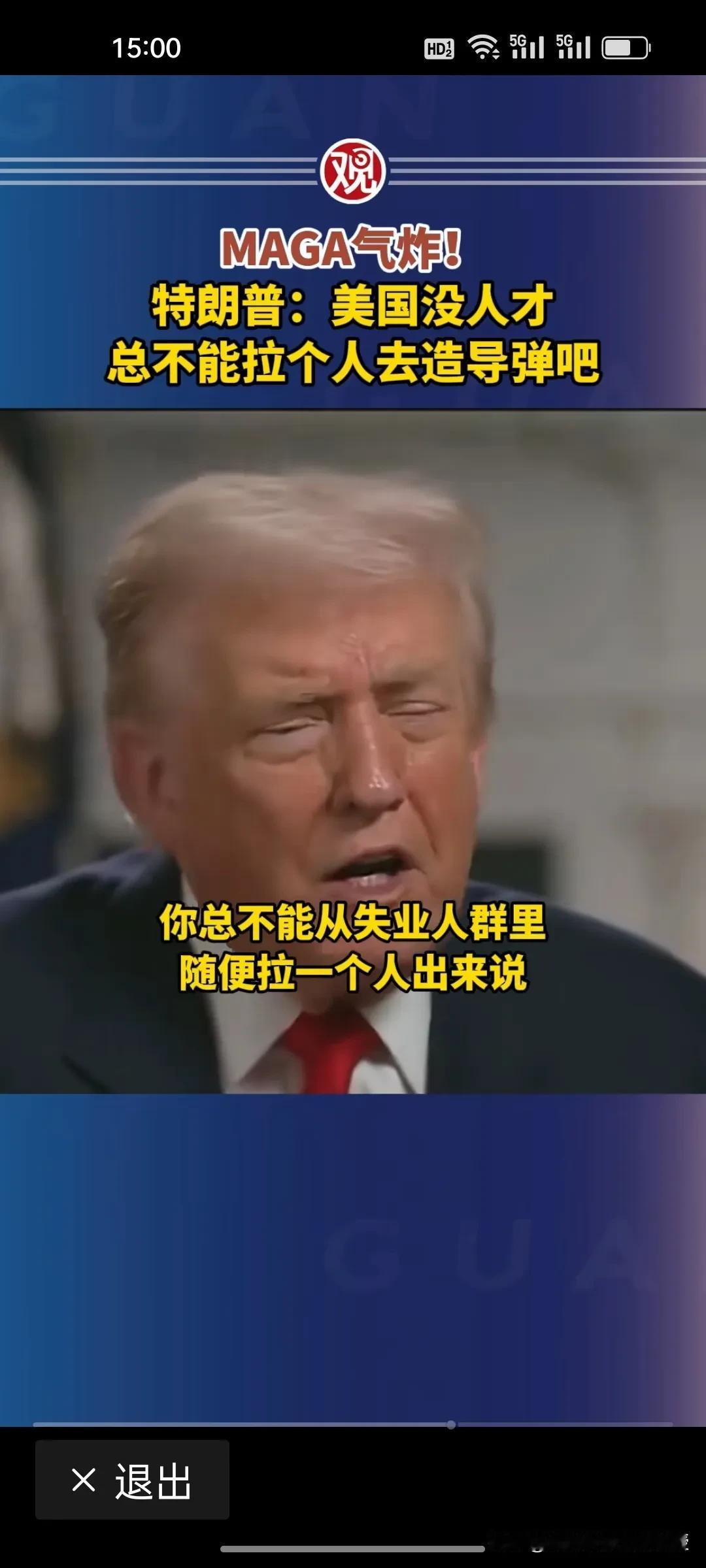 特朗普难得清醒啊!特朗普接受媒体访谈时称,美国没有人才,总不能拉个人去造导弹吧? 看下图,跟特朗普观点一致的还有美国前驻华大使伯恩斯,他说中国被严重低估了,美国的科技领军人就是华裔,美国没有竞争力,中国的军事和科技实力比他们想象中要强。 另外,美国前商务部长雷蒙多近期在哈佛大学演讲时说,“中国的华为很强大,上届美国政府还以为能打压华为,结果华为强势归来,造出了令人惊叹的芯片。” 美国政客其实个个心里都门清美国的现状,只不过在任期内能诚实说出来的只有特朗普而已。特朗普心里敬畏强者,一直对中国以“G2”相称。