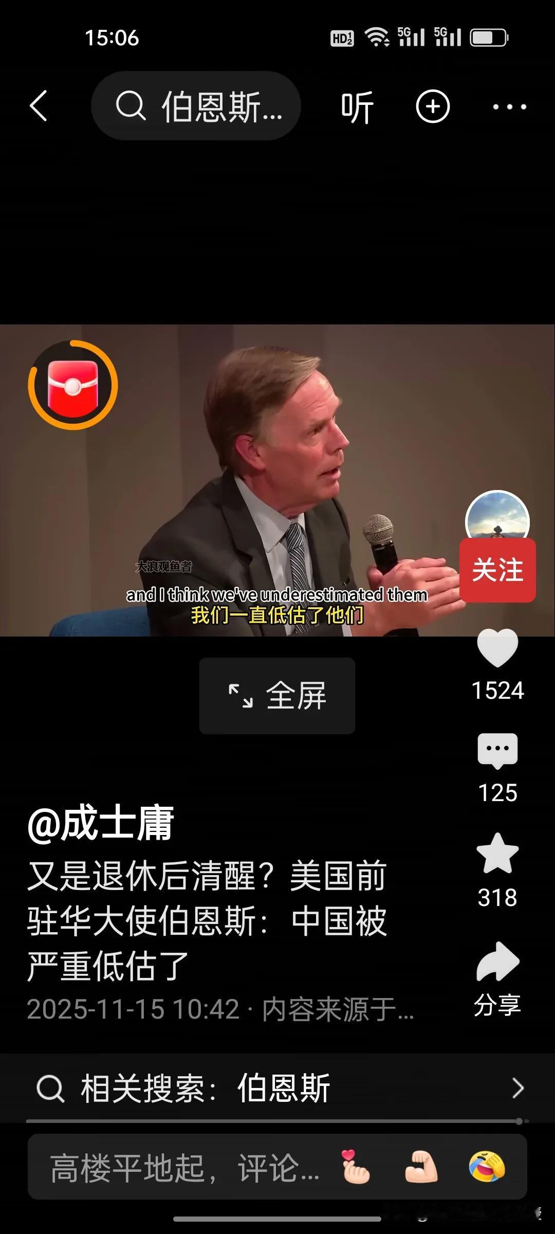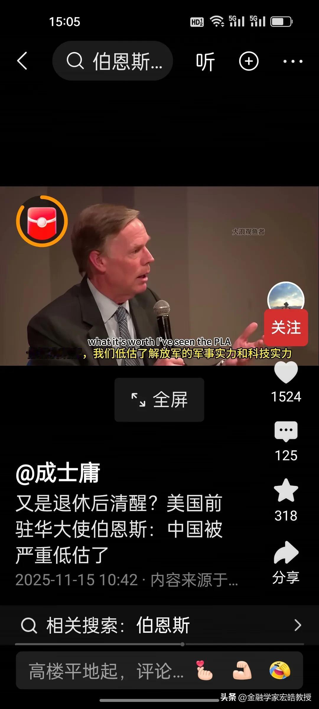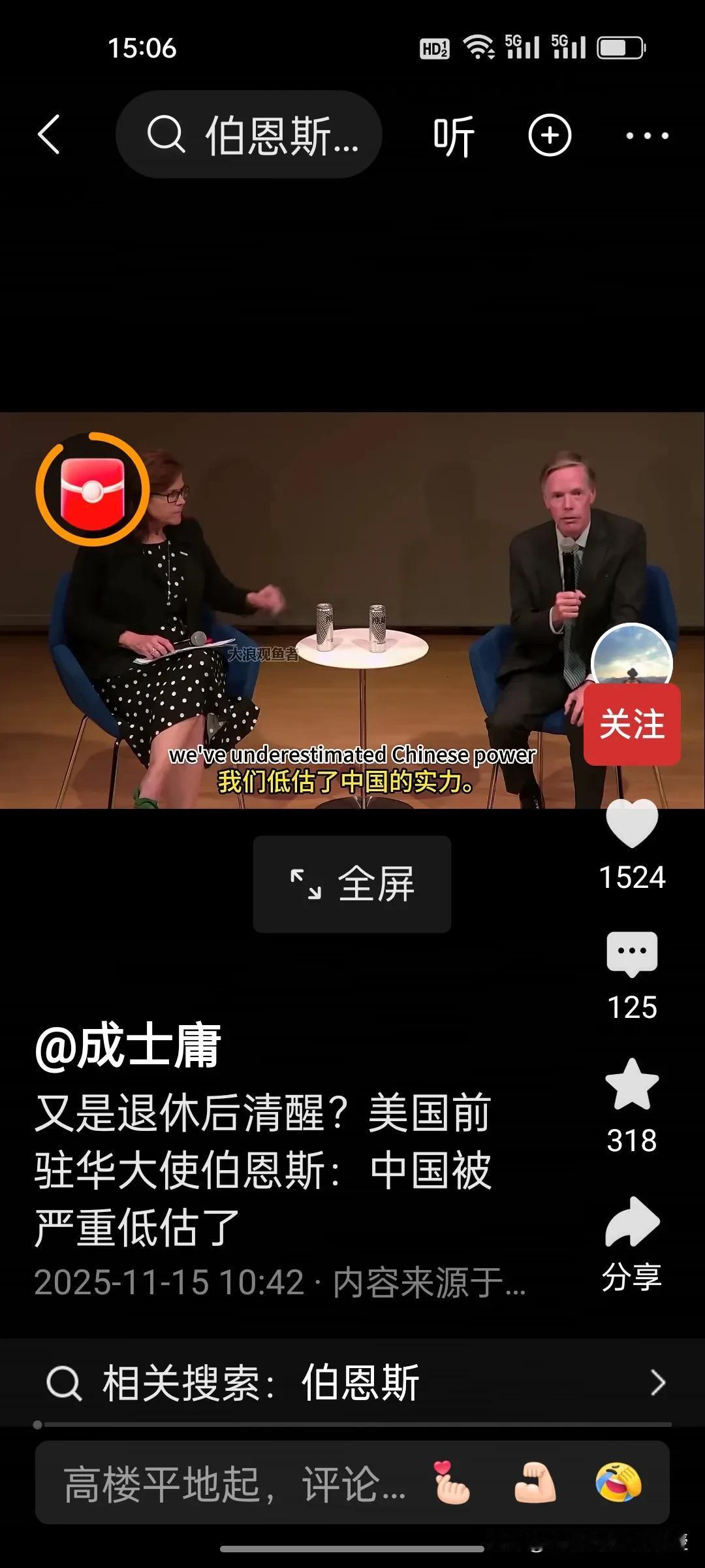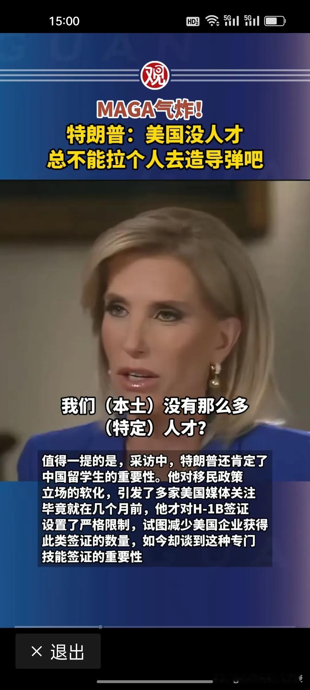 特朗普难得清醒啊!特朗普接受媒体访谈时称,美国没有人才,总不能拉个人去造导弹吧? 看下图,跟特朗普观点一致的还有美国前驻华大使伯恩斯,他说中国被严重低估了,美国的科技领军人就是华裔,美国没有竞争力,中国的军事和科技实力比他们想象中要强。 另外,美国前商务部长雷蒙多近期在哈佛大学演讲时说,“中国的华为很强大,上届美国政府还以为能打压华为,结果华为强势归来,造出了令人惊叹的芯片。” 美国政客其实个个心里都门清美国的现状,只不过在任期内能诚实说出来的只有特朗普而已。特朗普心里敬畏强者,一直对中国以“G2”相称。