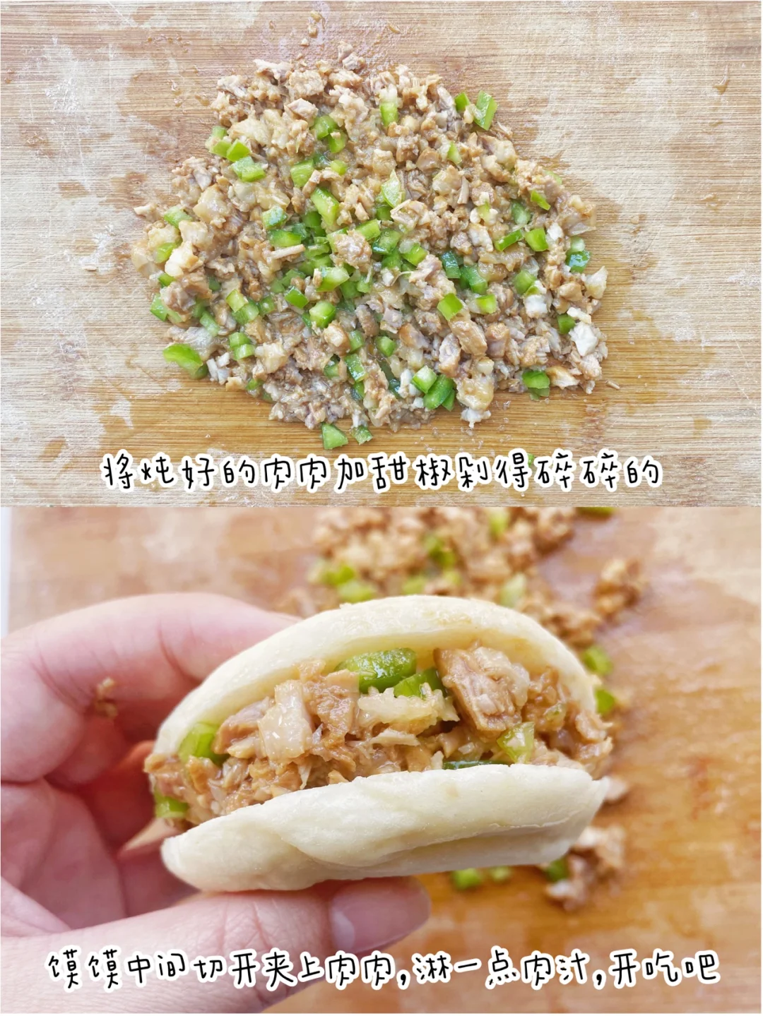 ▫️将炖好的肉肉加一把甜椒一起剁得碎碎的,馍馍中间切开夹上肉肉,淋一点汤汁开吃吧。🫑甜椒是不辣的那种哦,富含维生素的蔬菜,加了之后更好吃,不建议去掉。