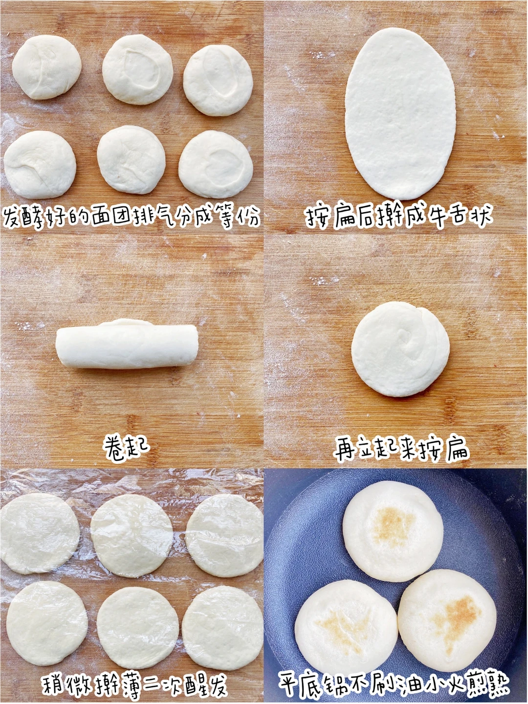 ▪️不粘锅不用刷油直接放入饼小火煎至两面上色,鼓起变大就是熟了。