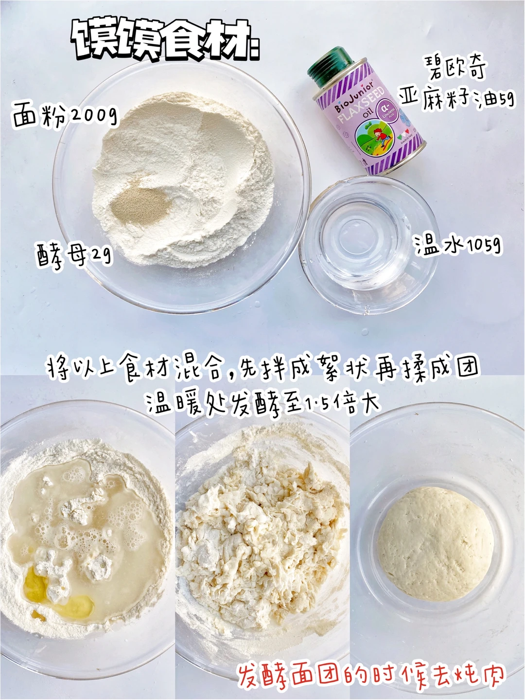 面粉200g、温水105g、酵母2g、碧欧奇亚麻籽油5g