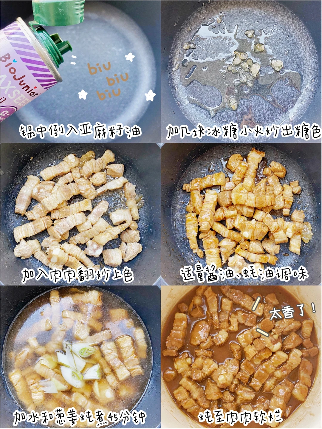 ▫️锅中放入亚麻籽油加入冰糖炒出糖色,加入肉肉翻炒上色,加适量酱油蚝油调味,再加入水和葱姜,盖上锅盖小火炖至肉肉软烂。