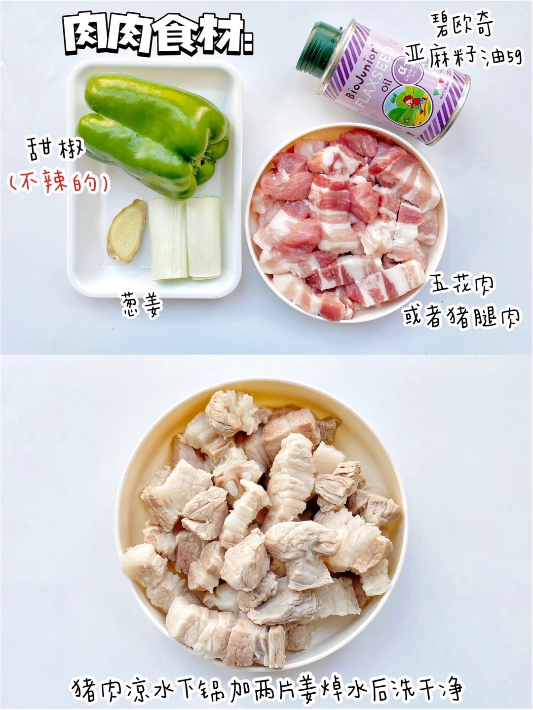 五花肉(或者猪腿肉,带点肥肉更好)、甜椒、葱姜、冰糖、酱油、蚝油、碧欧奇亚麻籽油