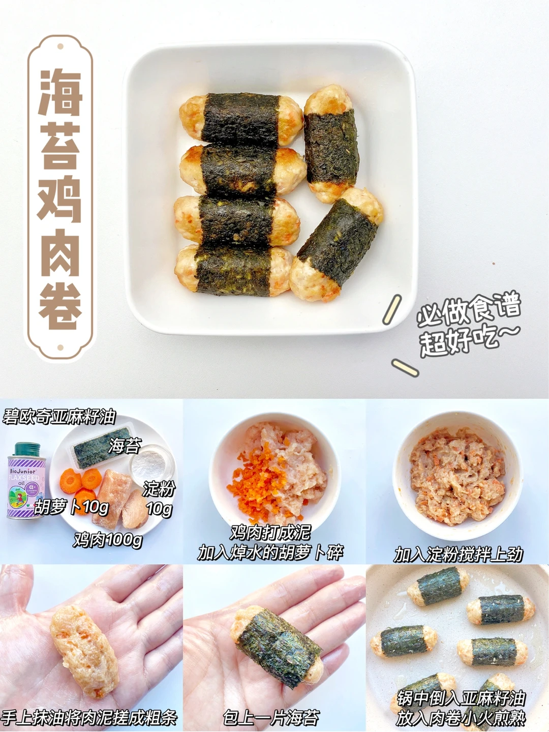 ☑️做法:鸡肉打成泥加入焯水的胡萝卜碎,加入淀粉搅拌均匀。手掌抹油将肉泥整理成粗条,包上一片海苔,锅中倒入亚麻籽油,放入肉卷小火煎熟。
