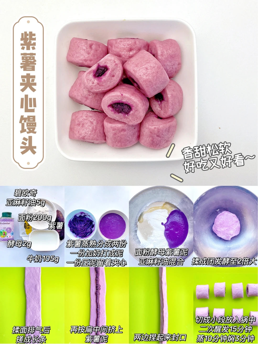 ☑️做法:紫薯蒸熟后取30g加牛奶打成泥,剩下的紫薯压成泥作为夹心。食材混合揉成团,发酵至2倍大,发酵好的面团揉面排气,搓成长条,再按扁,挤上之前准备好的紫薯泥,两边捏起来封好口。切成小段放入锅中二次醒发15分钟,蒸10分钟焖3分钟出锅。