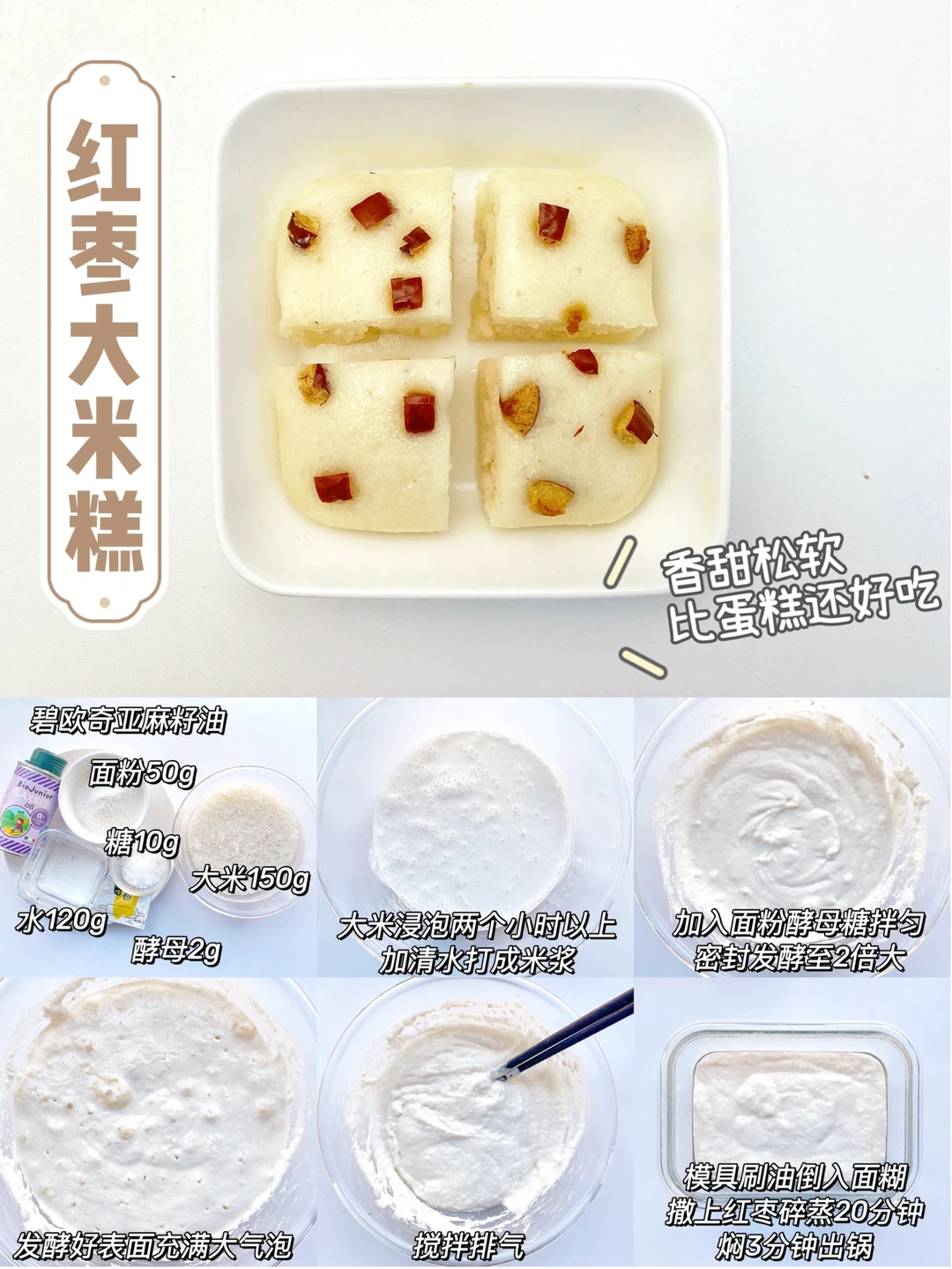 ☑️做法:大米提前浸泡2小时以上,加清水打成米浆,加入面粉酵母糖搅拌均匀,发酵至2倍大,发酵好后搅拌排气,模具刷油倒入面糊撒上红枣碎,上锅蒸20分钟焖3分钟。