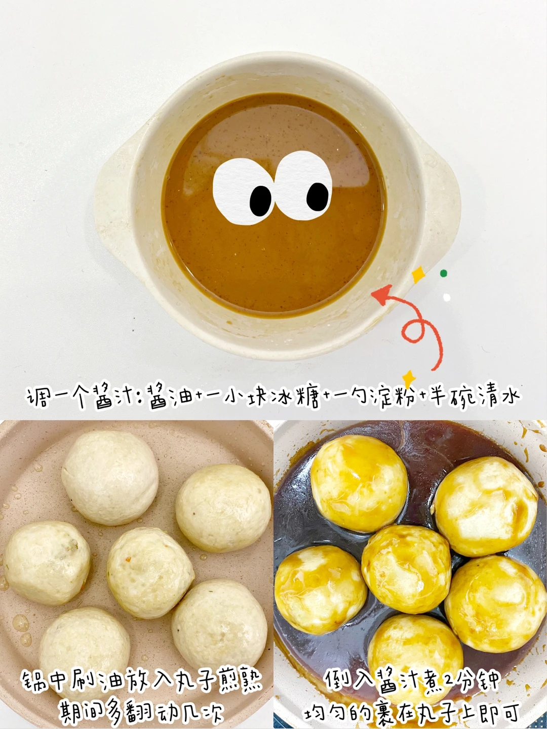 5⃣️锅中放油小火将丸子煎熟,煎的时候要多滚动一下。再倒入酱汁煮1分钟,均匀的裹在腕子上即可。