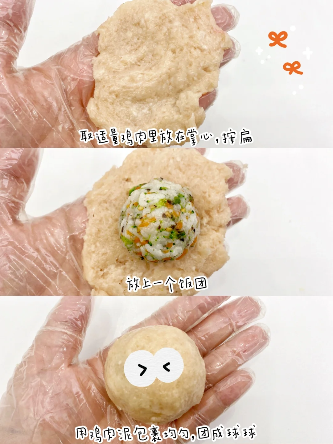 3⃣️取适量鸡肉泥放入掌心按扁,包入饭团,团成球球。