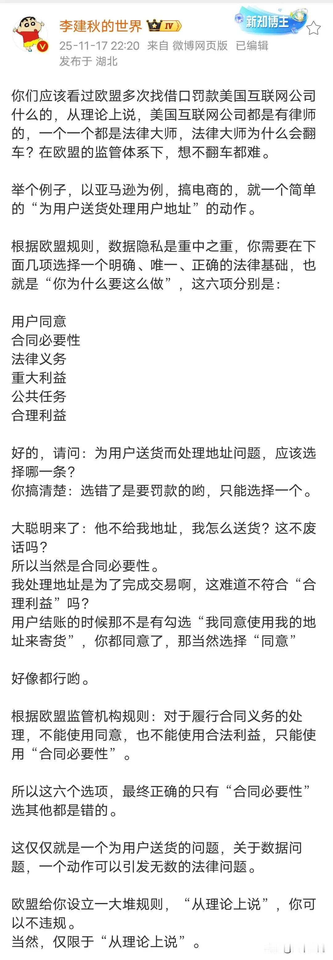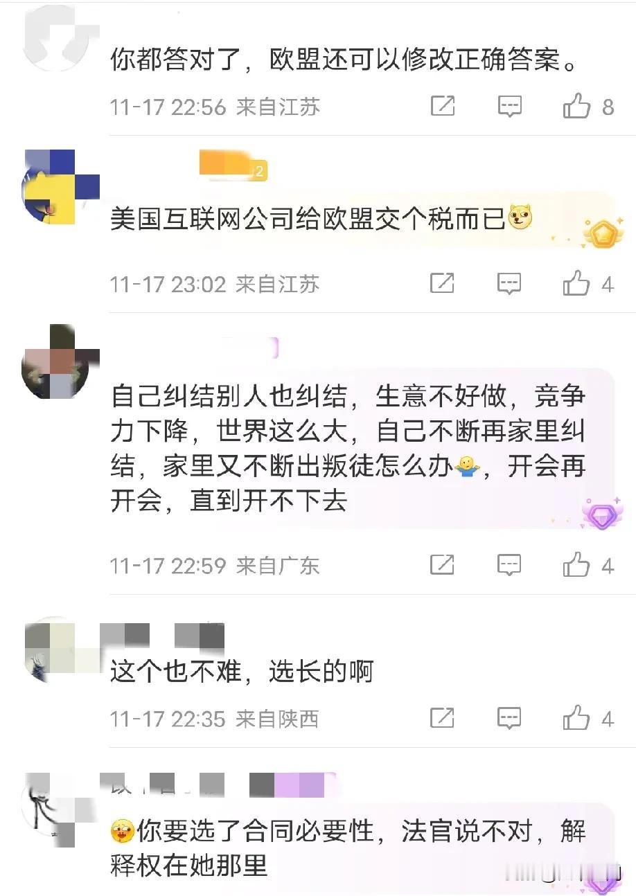 难怪欧洲的科技公司发展不起来,看了欧洲的法律条款,这都养活多少律师,难怪国内的法律圈出那么公知,都希望我们变成欧美那样的法律制度,嘴上都主义,心里都是生意,美国的律师已经非常厉害了,一年律师费几万亿美元,在美国只要有钱请得起著名律师,等于免死铁券,但是美国律师到欧洲也得熄火,很多美国互联网公司经常被欧洲罚巨款,有人说美国律师这么厉害,这么还会被罚这么惨,因为欧洲的法律条框令人发指,美国律师看了都摇头,欧洲最绝的是,你都答对了,我还可以修改正确答应,这比印度专门定制法律来罚你还无语,反正主打的就是欧洲要罚你款,你就老老实实交罚款就可以了!