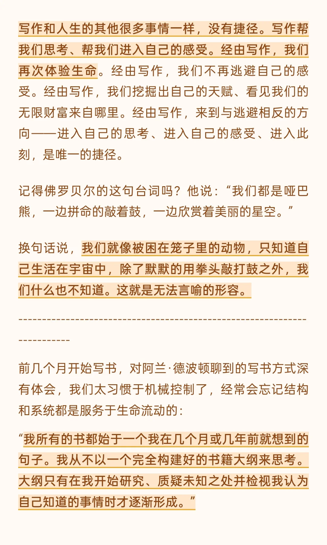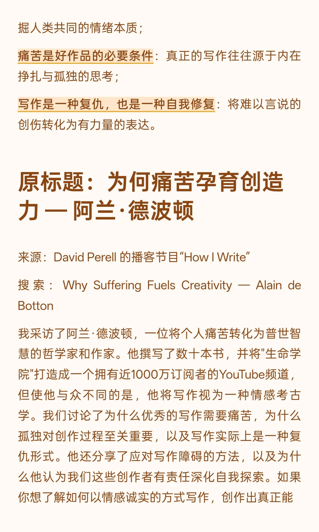 写作是思考与感受的捷径,帮助我们挖掘天赋与生命财富。 阿兰·德波顿强调写作是情感考古学,痛苦孕育创造力,写作是复仇与自我修复。 写作需诚实面对内心,关注感受与想法,而非依赖传统框架。 AI时代,会写作的人可能越开越少。而写作不仅仅是写作,而是一种思考的方式。 学会写作,真正能写出好文章,可能是对抗AI的有力武器之一。