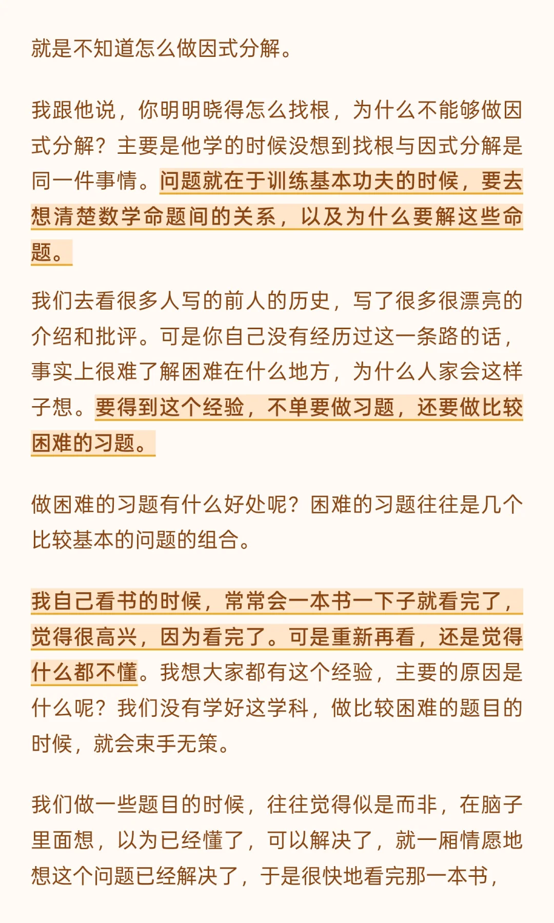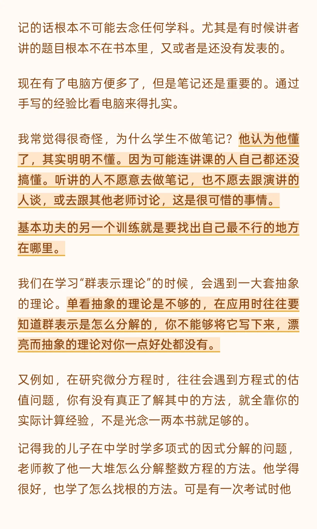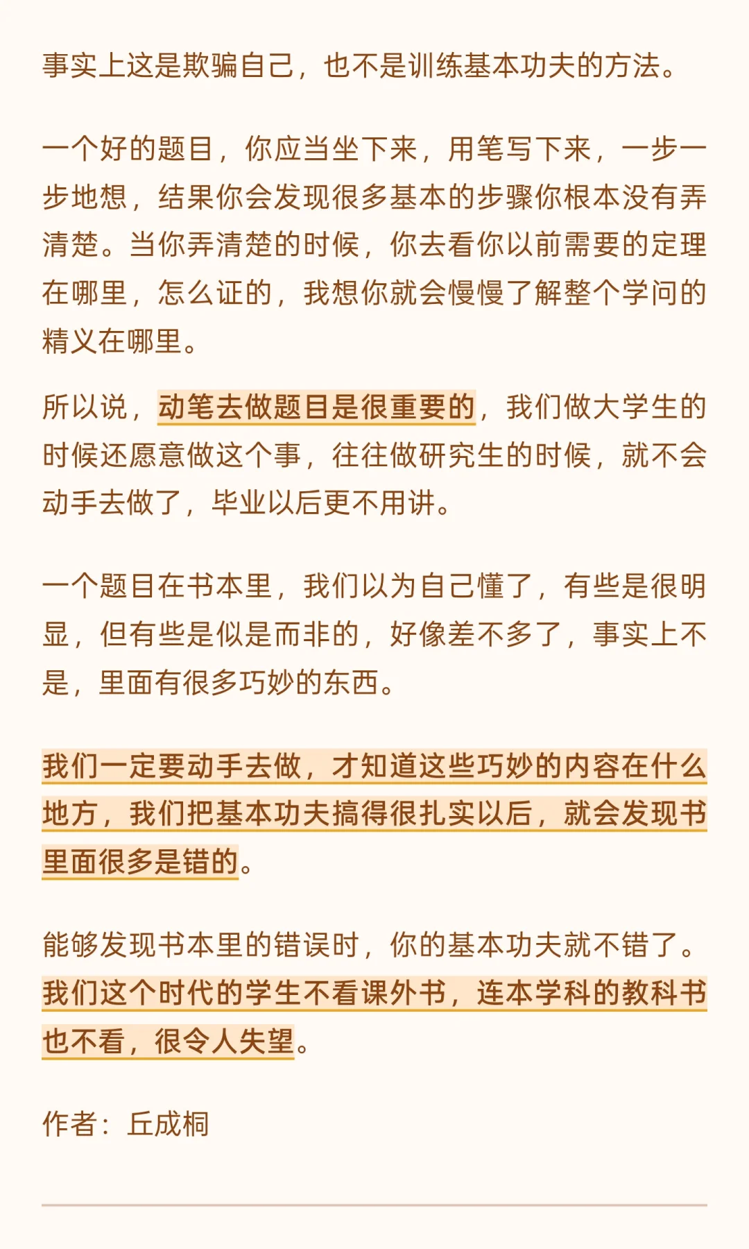 光看书是不够的,光听课也是不够的,训练基本功夫需通过做习题和笔记,理解理论与应用的联系。 找出不足,解决困难习题,掌握数学精义。 扎实基本功夫,发现书本错误,提升数学能力。 虽然大师讲的是数学,但是道理是相通的。对其他学科学习也是很好的参考与借鉴。