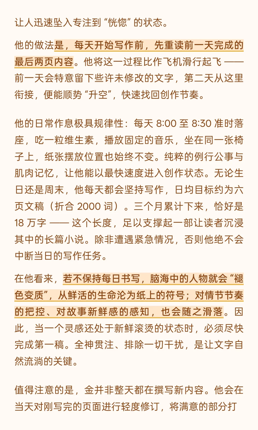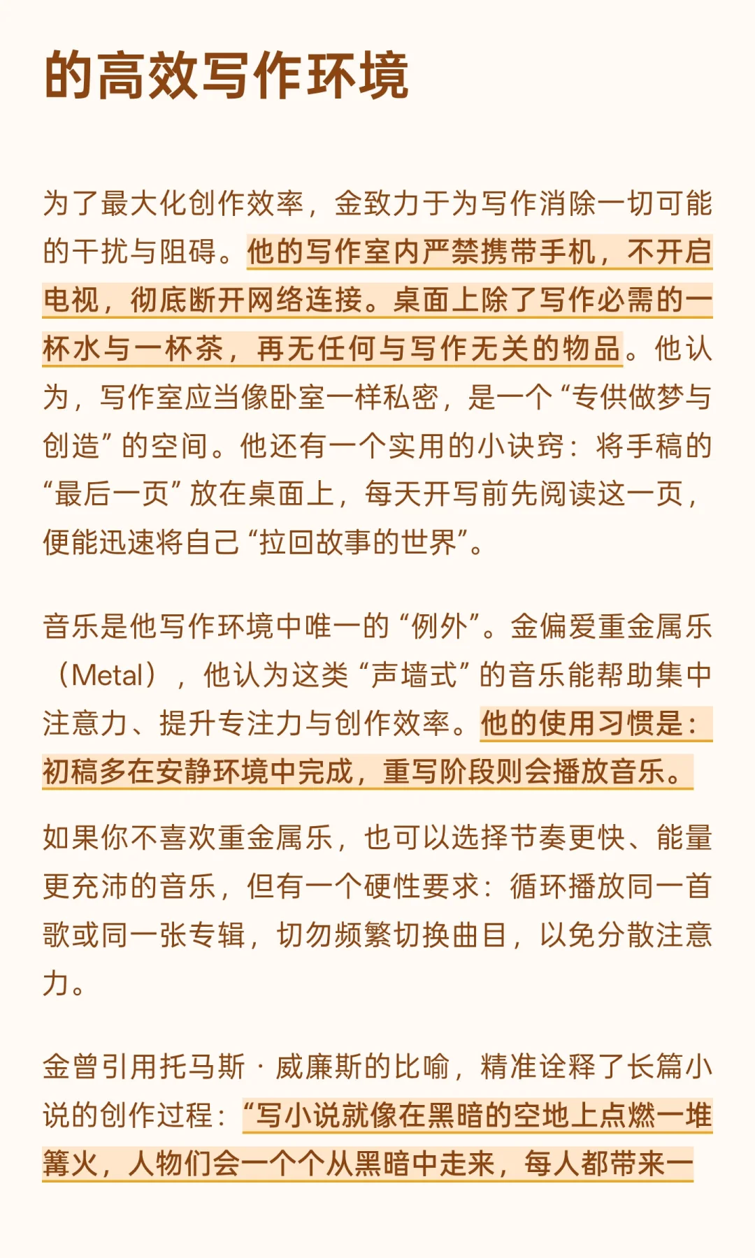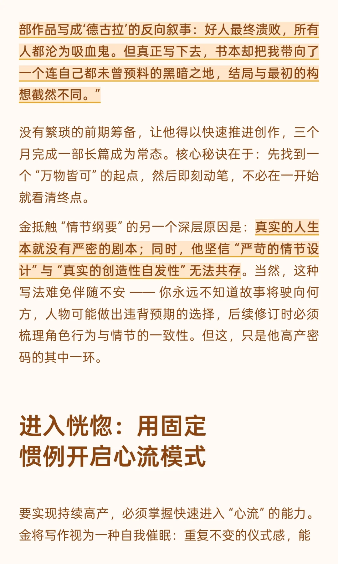 史蒂芬·金的高产秘诀包括即兴创作、固定写作习惯和严格修订。 他通过“高产三步法”快速推进创作,确保故事连贯且自洽。这套方法帮助他保持高效,每月完成一部长篇小说。