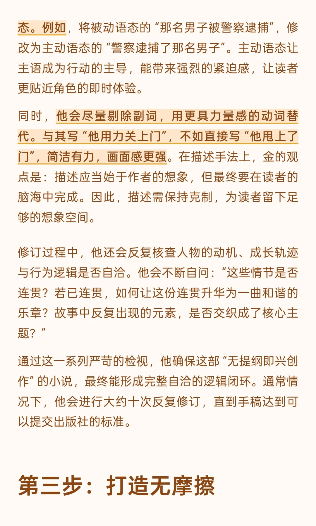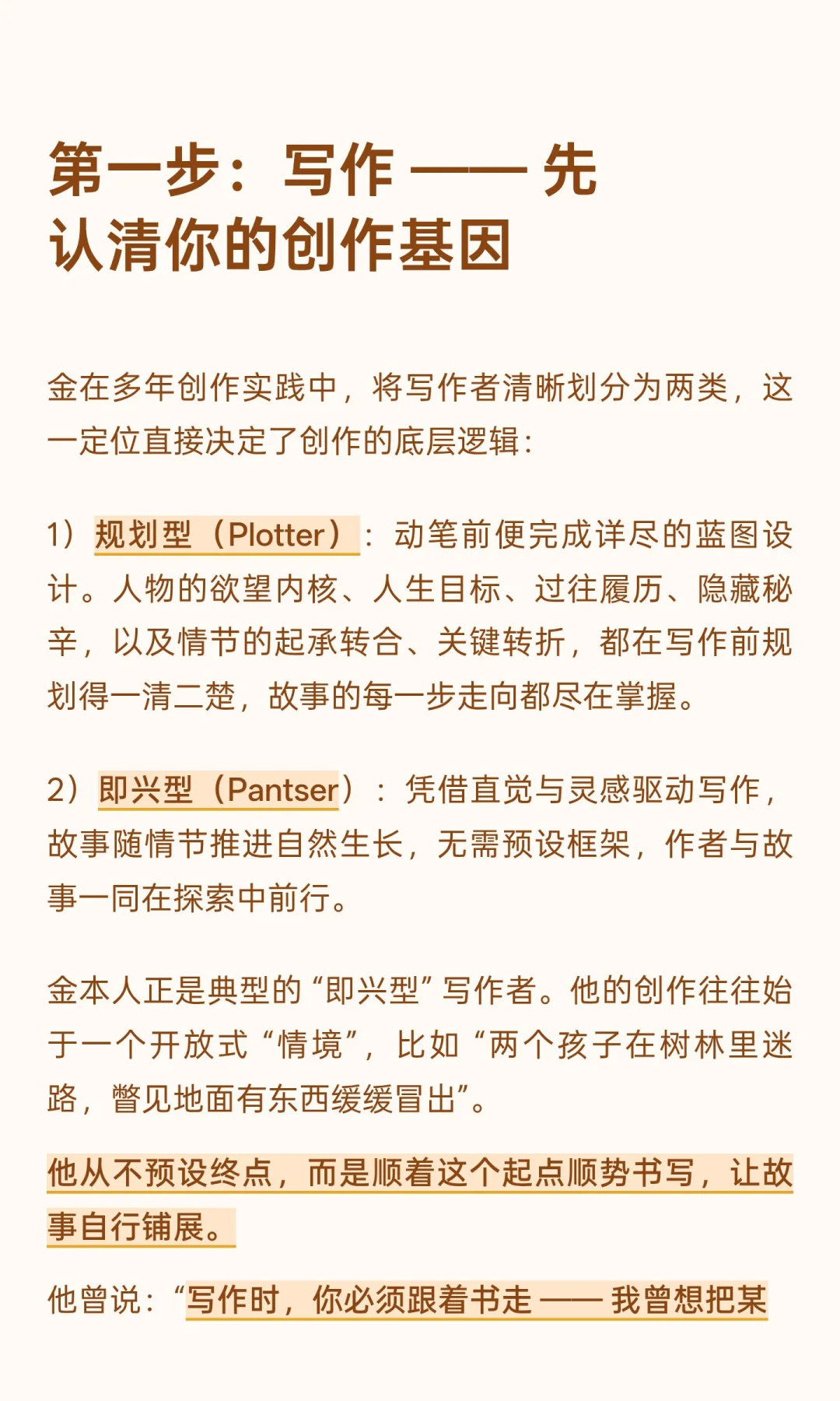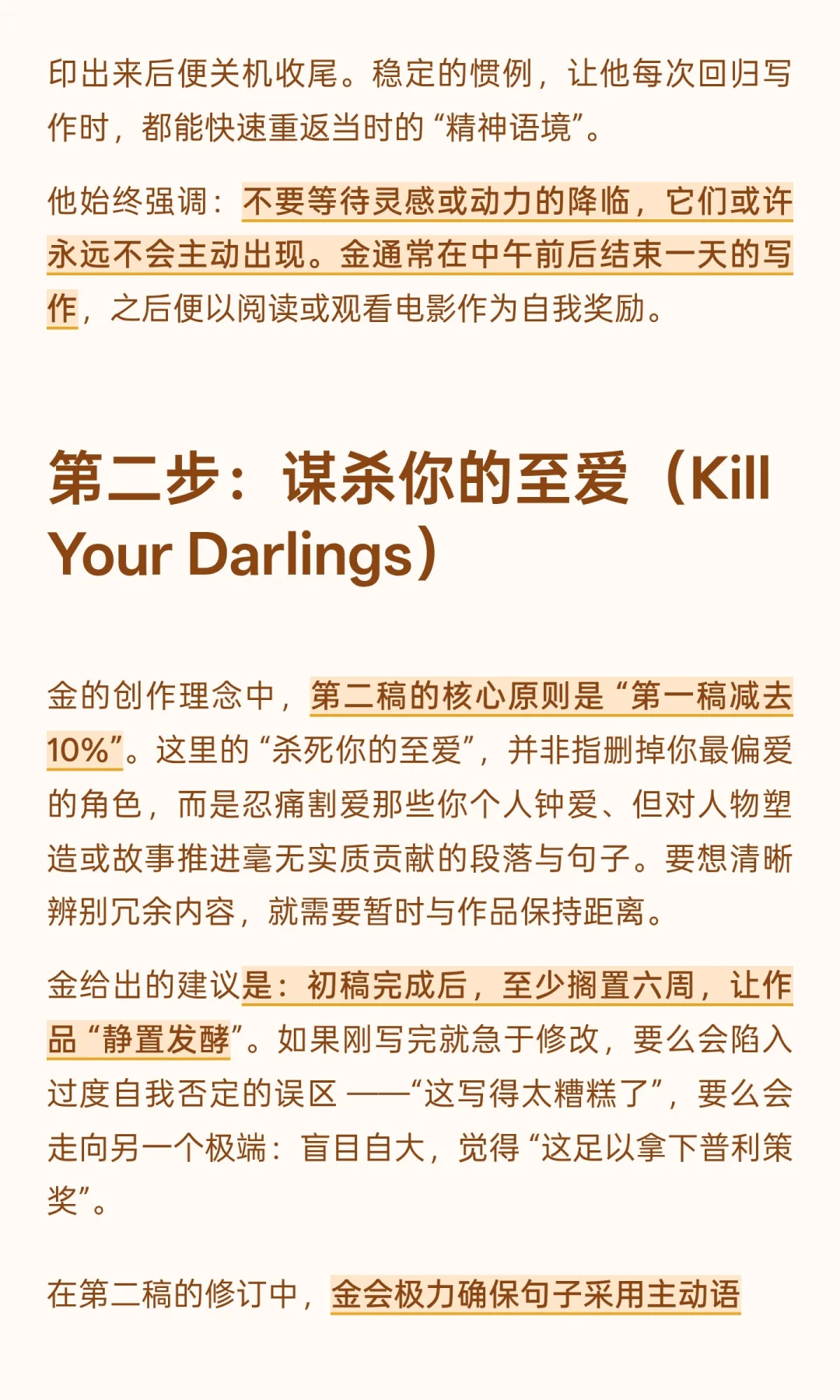史蒂芬·金的高产秘诀包括即兴创作、固定写作习惯和严格修订。 他通过“高产三步法”快速推进创作,确保故事连贯且自洽。这套方法帮助他保持高效,每月完成一部长篇小说。