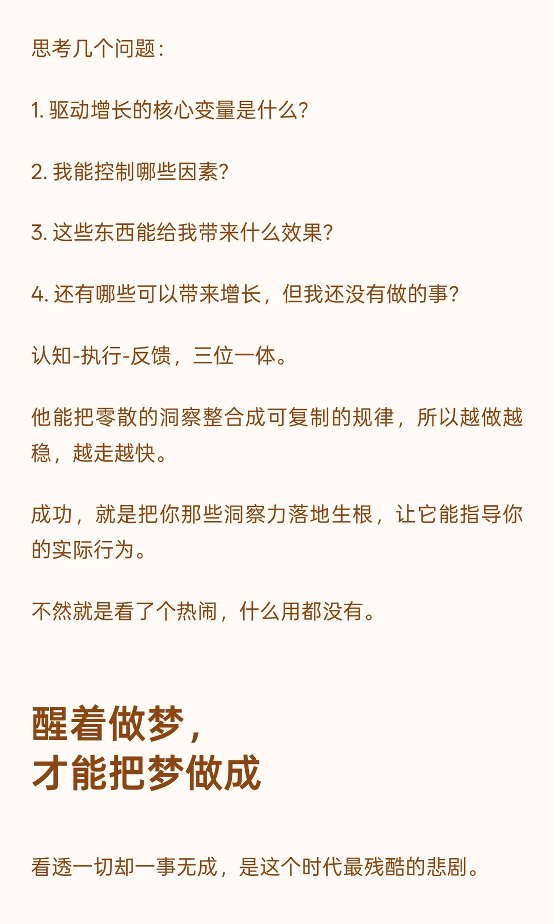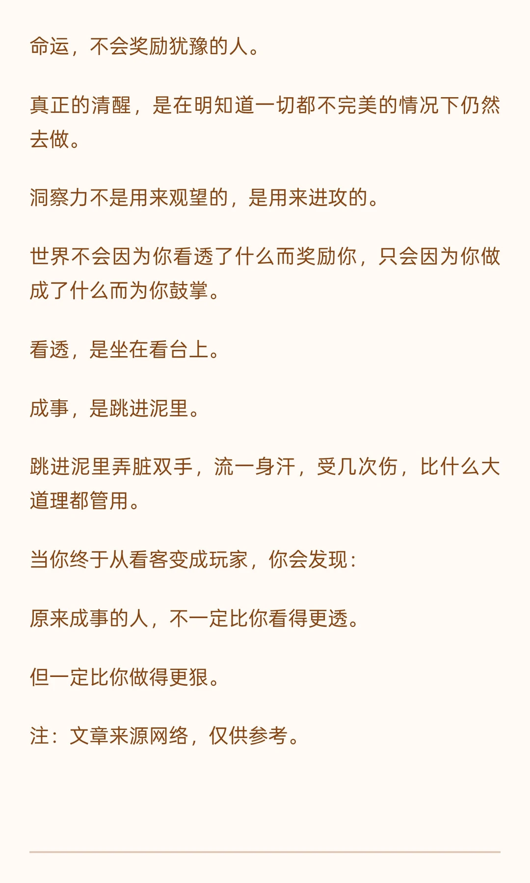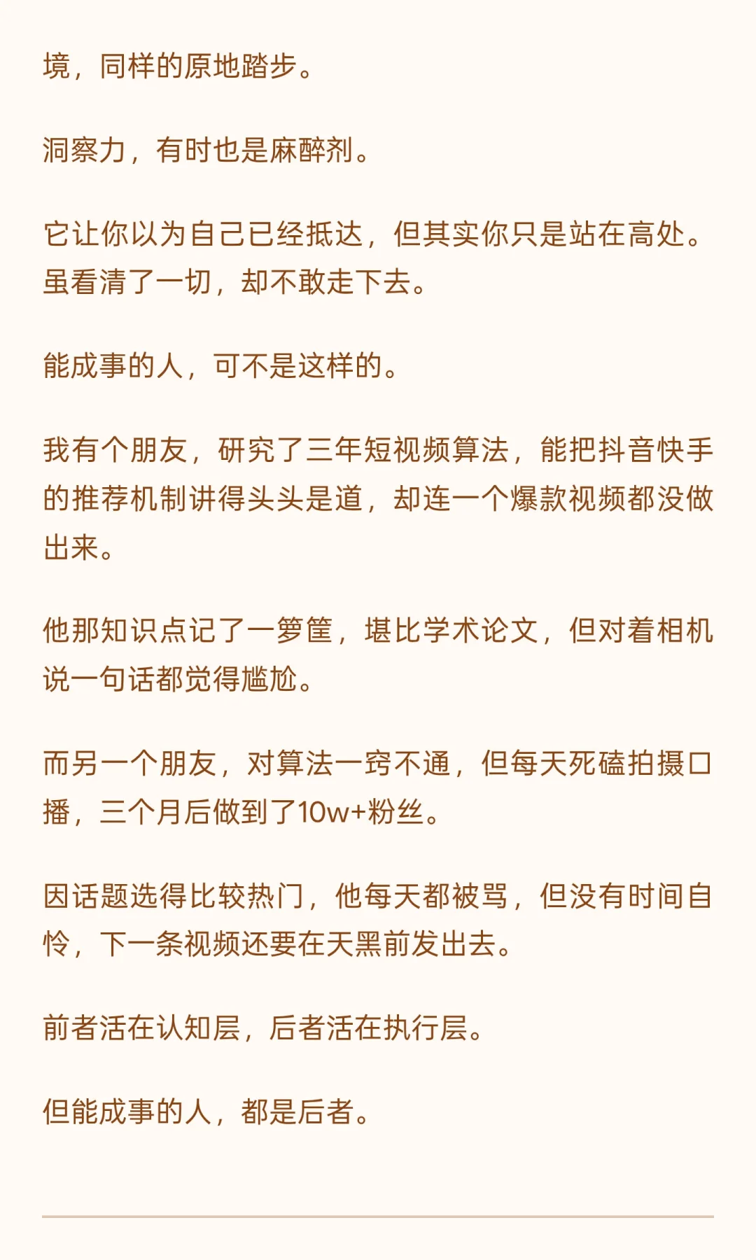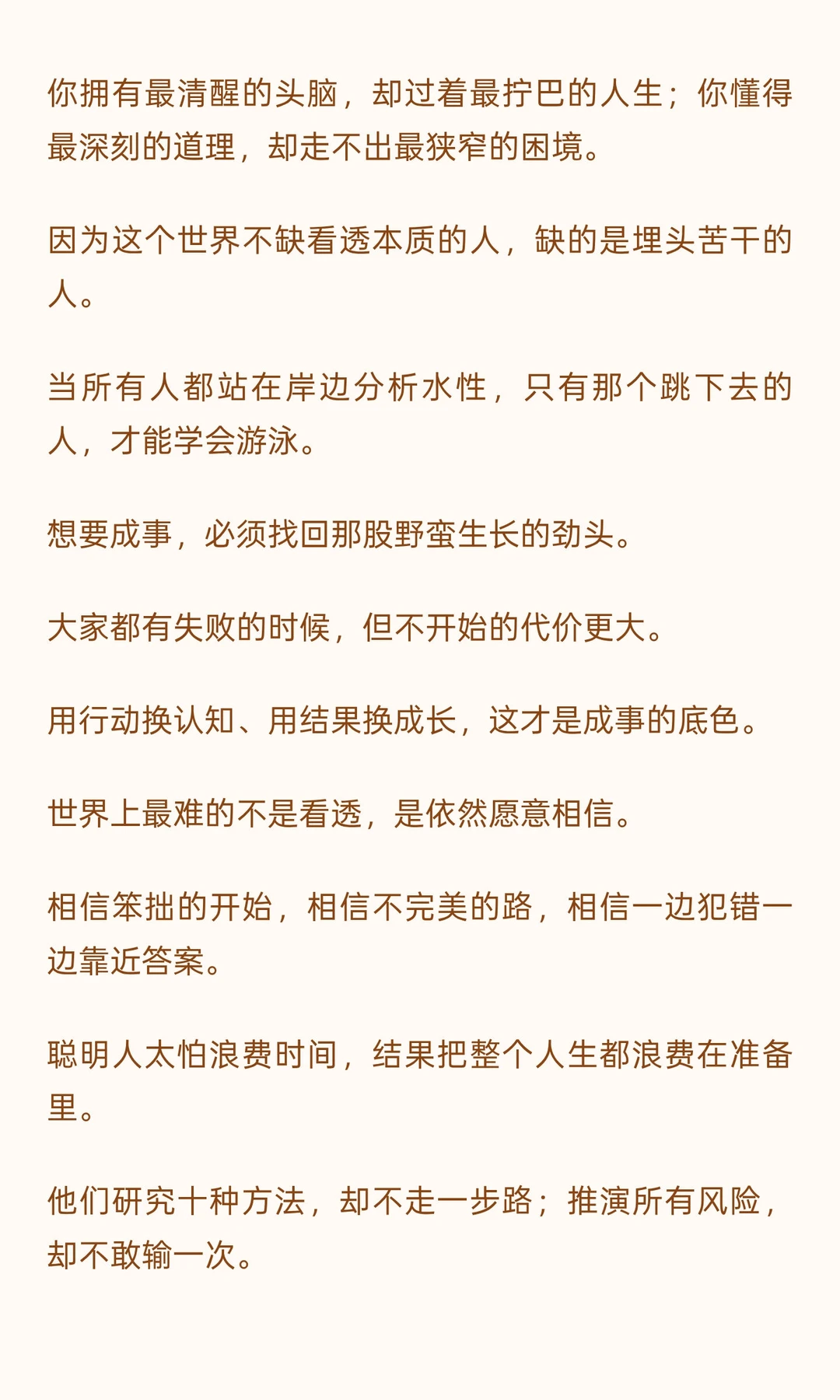 洞察力让人看清本质,但行动才是成功的关键。 陶行知说,行是老子,知是儿子,创新是孙子。行动是知道的开始,也是知道的皈依。 聪明人常因完美主义陷入犹豫,真正成事的人敢于行动,将洞察力转化为实际成果。 成功源于从观望到实践的转变,只有埋头苦干,才能真正掌握命运。 学习了这么知识,读了这么多书,遇事还缩手缩脚的,这么算哪门子知?学习和读书,不是让人生出无限豪气与勇气么?!