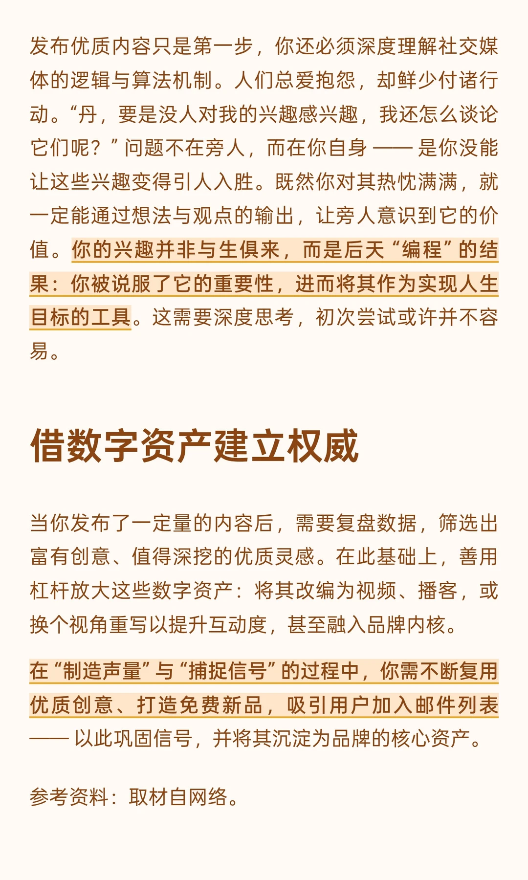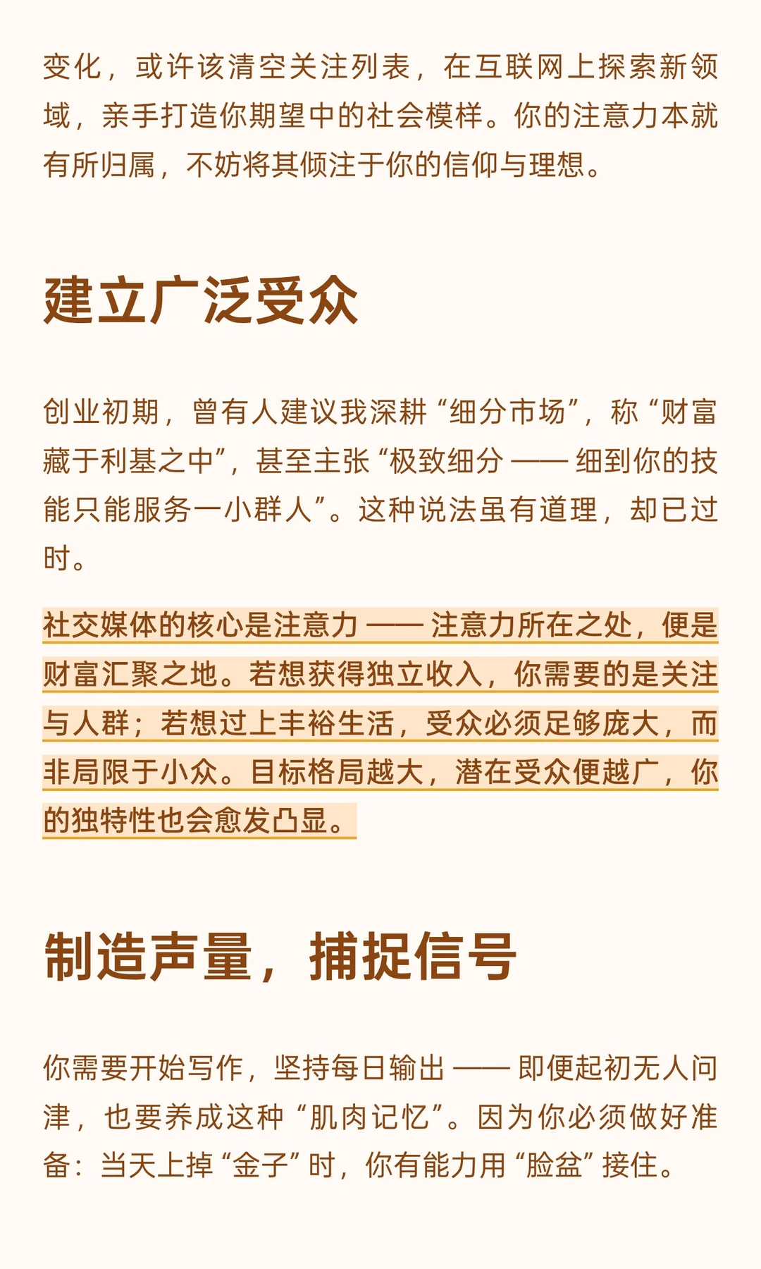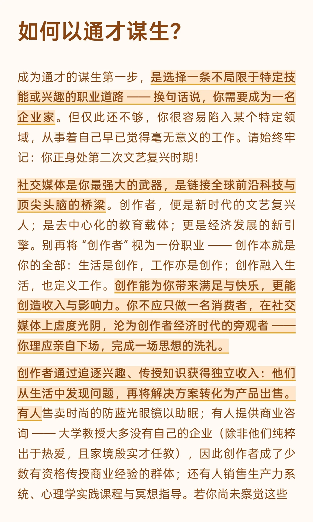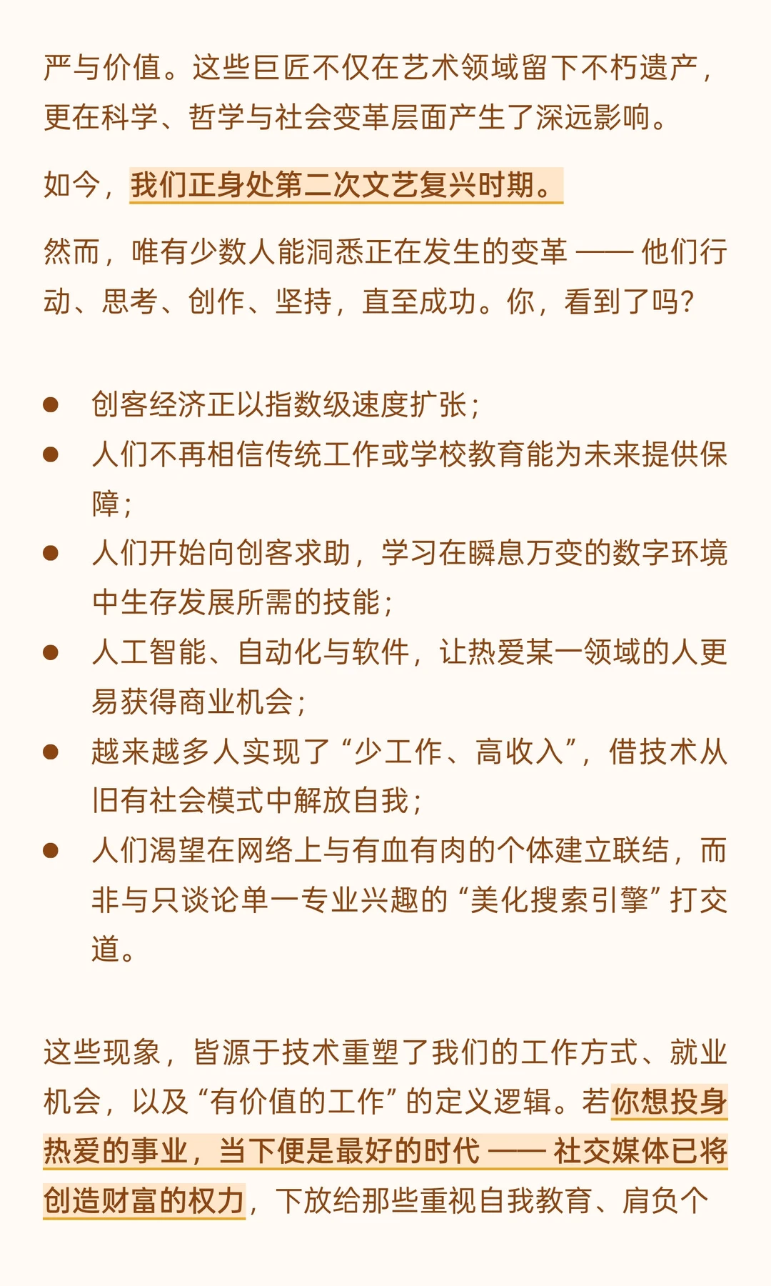 创作能为你带来满足与快乐,更能创造收入与影响力。你不应只做一名消费者,在社交媒体上虚度光阴,沦为创作者经济时代的旁观者 —— 你理应亲自下场,完成一场思想的洗礼。