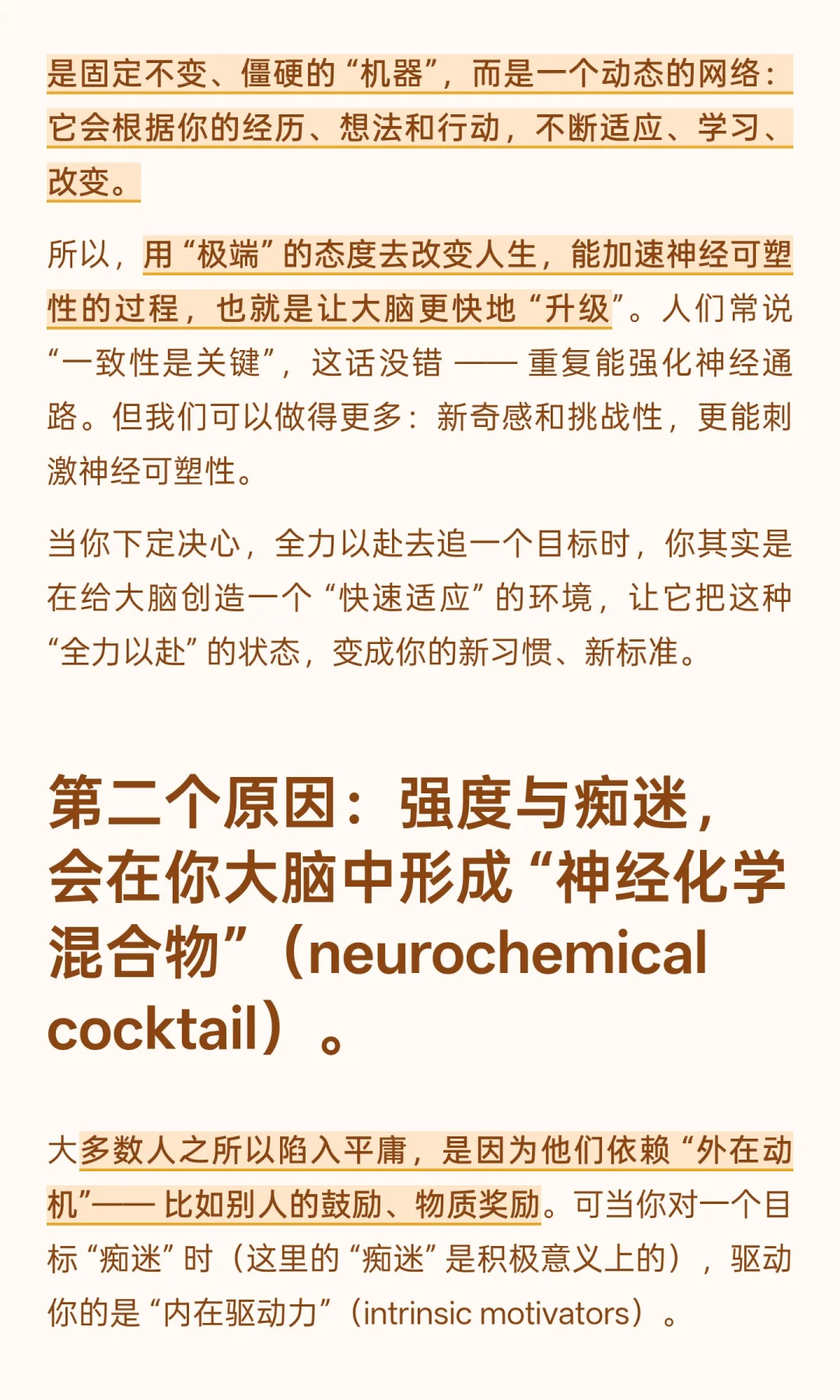油管大神认为,改变人生需“极端”态度,通过“痴迷”重塑大脑,强化神经可塑性,形成“神经化学混合物”,带来内在驱动力,聚焦目标,专注项目、阅读、冥想和锻炼,逐步实现自我提升与目标达成。