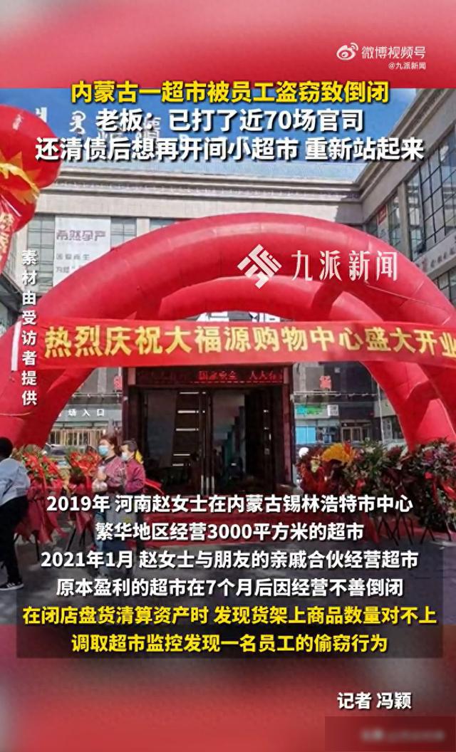 与人合伙经营超市被员工偷到倒闭,经济损失逾200万元,女老板起诉合伙人。11月17日晚,赵女士向九派新闻记者表示,她已经接到法院的通知,原定于明日的二审延期。赵女士告诉九派新闻,事发前,自己生活很“完美”,“我有一儿一女,有这个超市”,赵女士说,事发时,自己感觉很震惊,也特别的崩溃,完全想象不到,“其中还有一个跟了我三年的老员工,本来一车的东西,打了特价五毛的标签就结了,和蚂蚁搬家一样”。事发至今,有些员工自己甚至都联系不上。