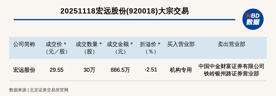 每经讯,2025年11月18日,北交所上市公司宏远股份(920018,收盘价:30.31元)发生一笔大宗交易,成交价29.55元/股,成交数量30万股,成交金额886.5万元,折价2.51%。买入营业部是机构专用,卖出营业部是中国中金财富证券有限公司铁岭银州路证券营业部。
