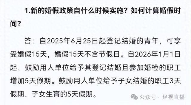 11月18日,记者从此前黄冈市人民政府发布的《关于支持积极婚育的若干措施》通知中获悉,自2025年6月25日起登记结婚的青年,可享受15天婚假,该假期不含法定节假日。自2026年1月1日起,黄冈市将新增两项鼓励性假期:一是鼓励用人单位为登记结婚并参加婚检的职工增加5天假期;二是鼓励用人单位给予子女结婚的职工3天假期,子女生育时给予5天假期。