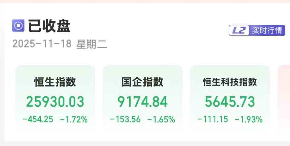 上证报中国证券网讯(卢伊记者严晓菲)11月18日,港股三大指数集体收跌。截至收盘,恒生指数跌1.72%,报25930.03点;恒生国企指数跌1.65%,报9174.84点;恒生科技指数跌1.93%,报5645.73点。