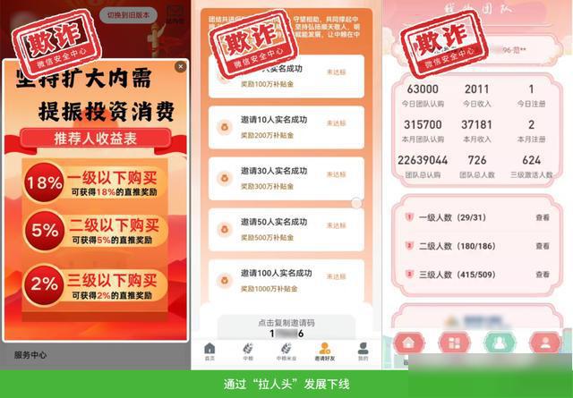 这类型的骗局通过“高额回报”吸引用户的注意力,同时鼓励用户“拉人头”发展他人成为自己的下线,以此获取更多收益。当拉人的资金不足以支付上线的收益时,资金链就会断裂,组织团伙便会迅速卷款跑路,参与者将面临资金损失和信息泄露双重风险。