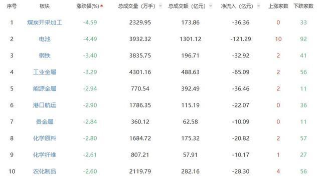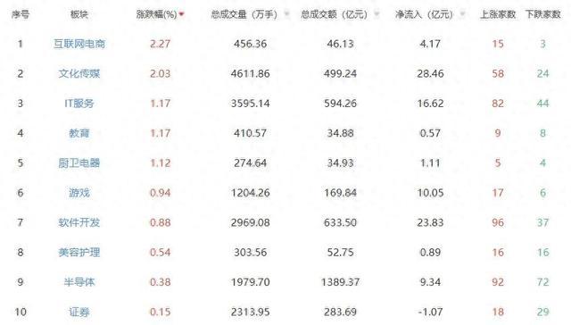 板块方面,互联网电商、文化传媒、IT服务、教育等涨幅居前,煤炭开采加工、电池、钢铁、工业金属等跌幅居前。