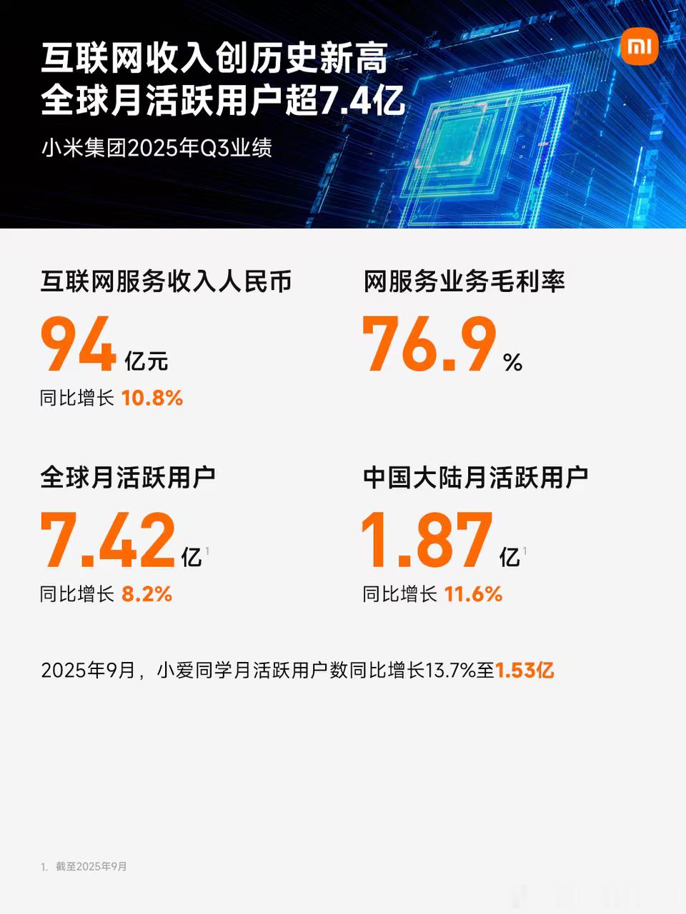 小米集团2025第三季度财报来了智能电动汽车当季新车交付108796台,小米YU7位居10月国内SUV车型销量第一总收入1131亿元,连续4个季度超千亿,同比增长22.3%;经调整净利润113亿元,同比增长80.9%。智能电动汽车及AI等创新业务收入290亿元【首次实现单季盈利】智能手机全球出货量4330万台,连续9个季度同比增长;单季度研发投入91亿IoT业务收入276亿元,连续7个季度同比增长;互联网业务收入94亿元,创下历史新高。