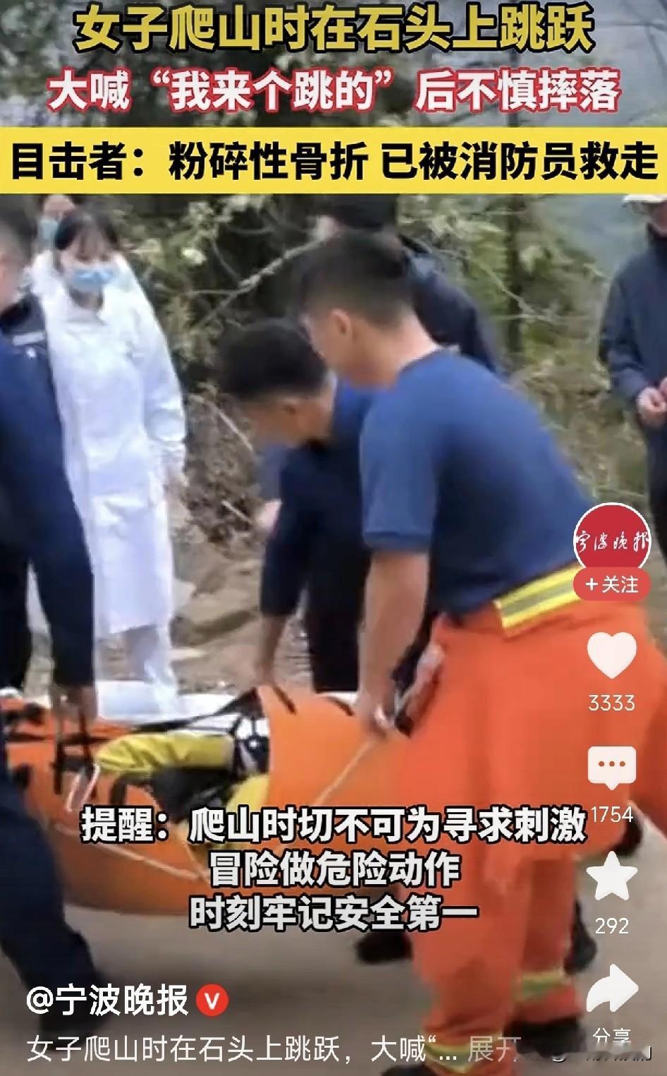 好险啊!女子爬山时在石头上大喊“我来个跳的,你们看着”后不慎摔进石缝,粉碎性骨折已被消防员救走! 说实话,看完除了揪心,更想说:真别把“勇敢”用错地方啊! 咱们现在很多人,一出门玩就有点“飘”。站悬崖边摆姿势,爬野路显胆量,还非发朋友圈说“挑战自我”。可大自然不是游乐场,它不讲情面、不看你表情美不美。一脚踩空、一阵风吹、一秒头晕,都可能酿成无法挽回的后果。 这让我想起一句话:真正的户外爱好者,首先是“敬畏自然”,而不是“征服自然”。你戴个帽子墨镜就敢往险处冲,那不是潇洒,是赌运气呢。 也不要说“我以前也这样,没事”。意外之所以叫意外,就是因为谁都觉得“不会是我”。 出去玩,图的是开心,不能让人惊心,平安回家更重要。别让一次逞能,成为家人一辈子的痛。 希望这位女士早日康复,也希望更多人记住:命要比一个点赞、一句“哇你好厉害”值钱得多了。大家说对吗?