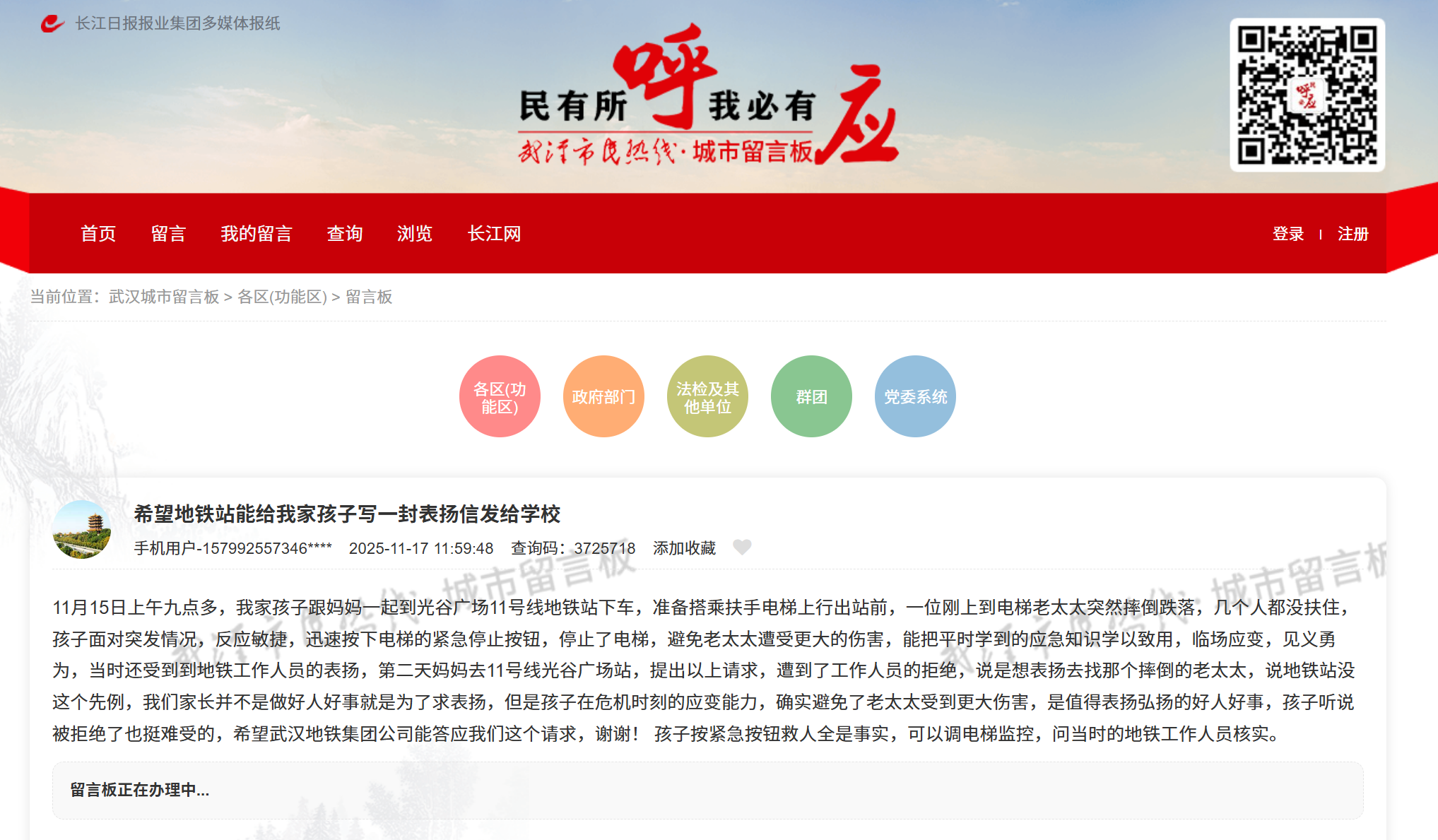 官方信息显示,武汉城市留言板是武汉市委市政府践行以人民为中心的发展思想,通过网络走群众路线,了解群众所思所愿、收集好想法好建议、积极回应网民关切和解疑释惑的创新平台,2017年4月上线运行,网民可随时随地留言投诉、咨询、建言、求助、点赞等,各区各部门160余家办理单位在线“接单”,限时办结,公开回复,接受评价。